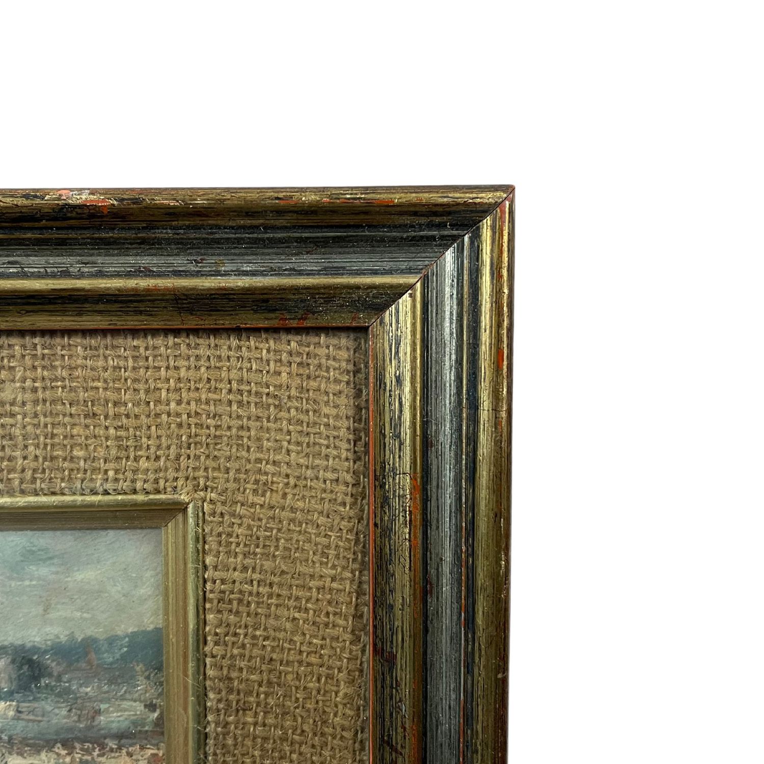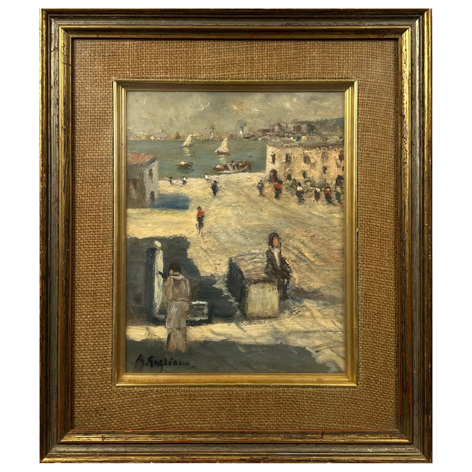 Dipinto olio su pannello, periodo XX secolo, raffigurante Marina con personaggi e barche.