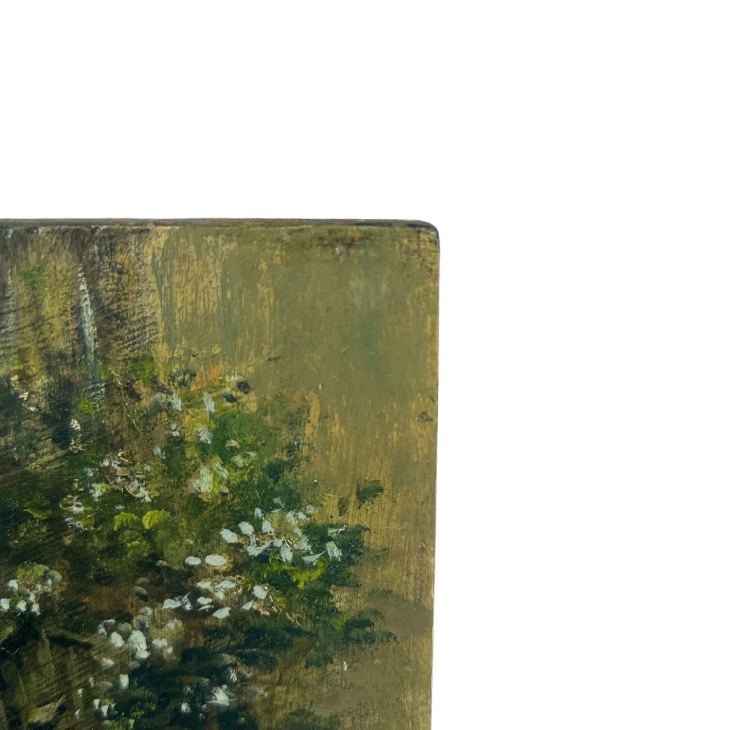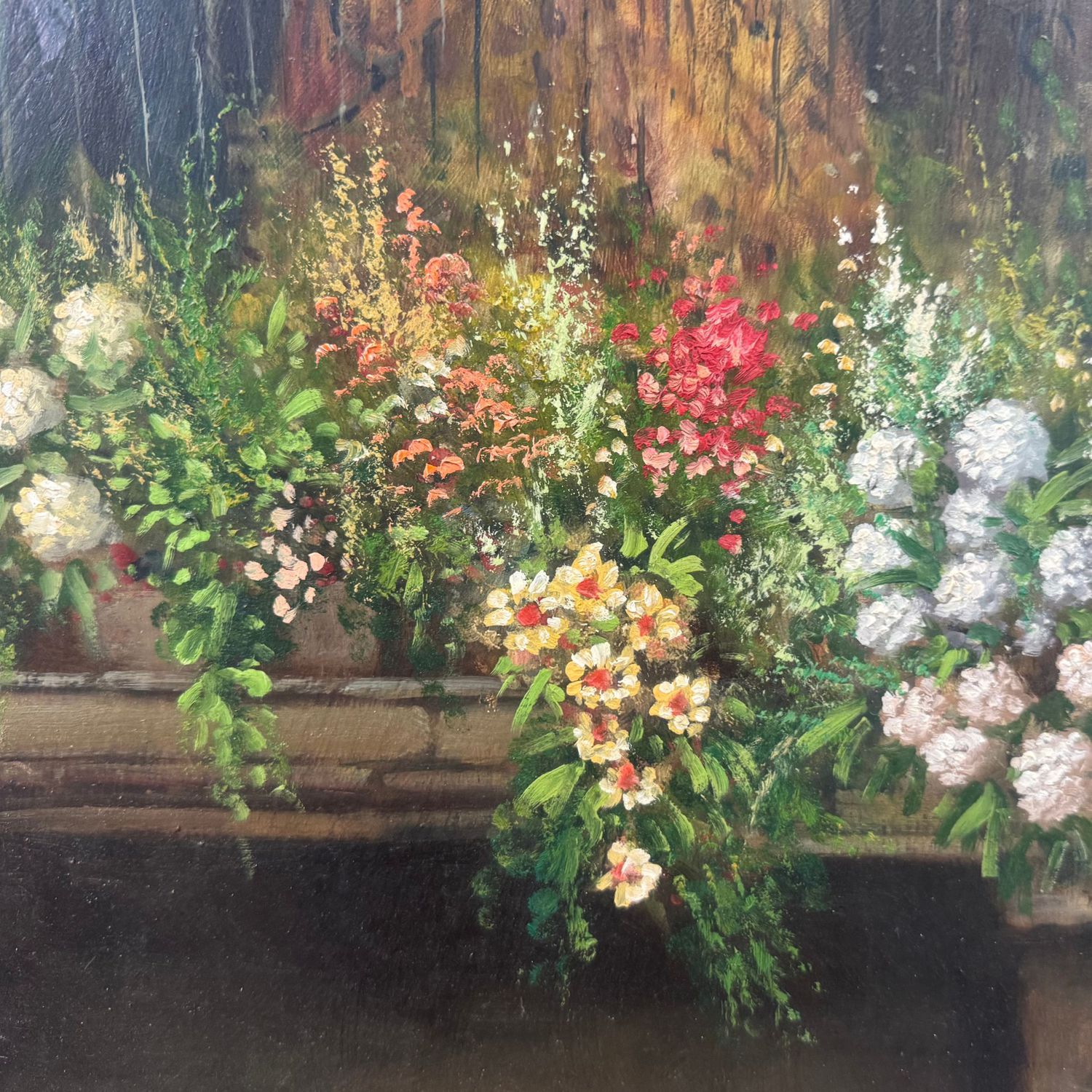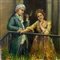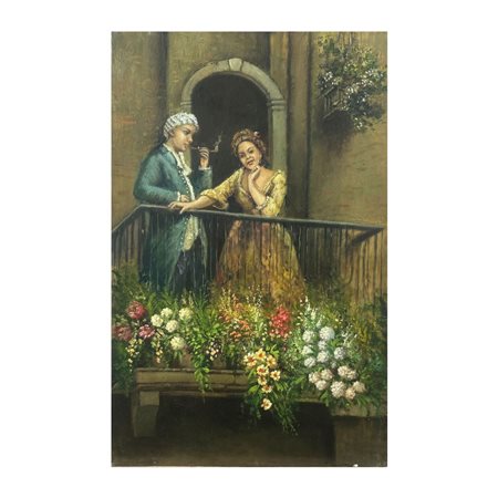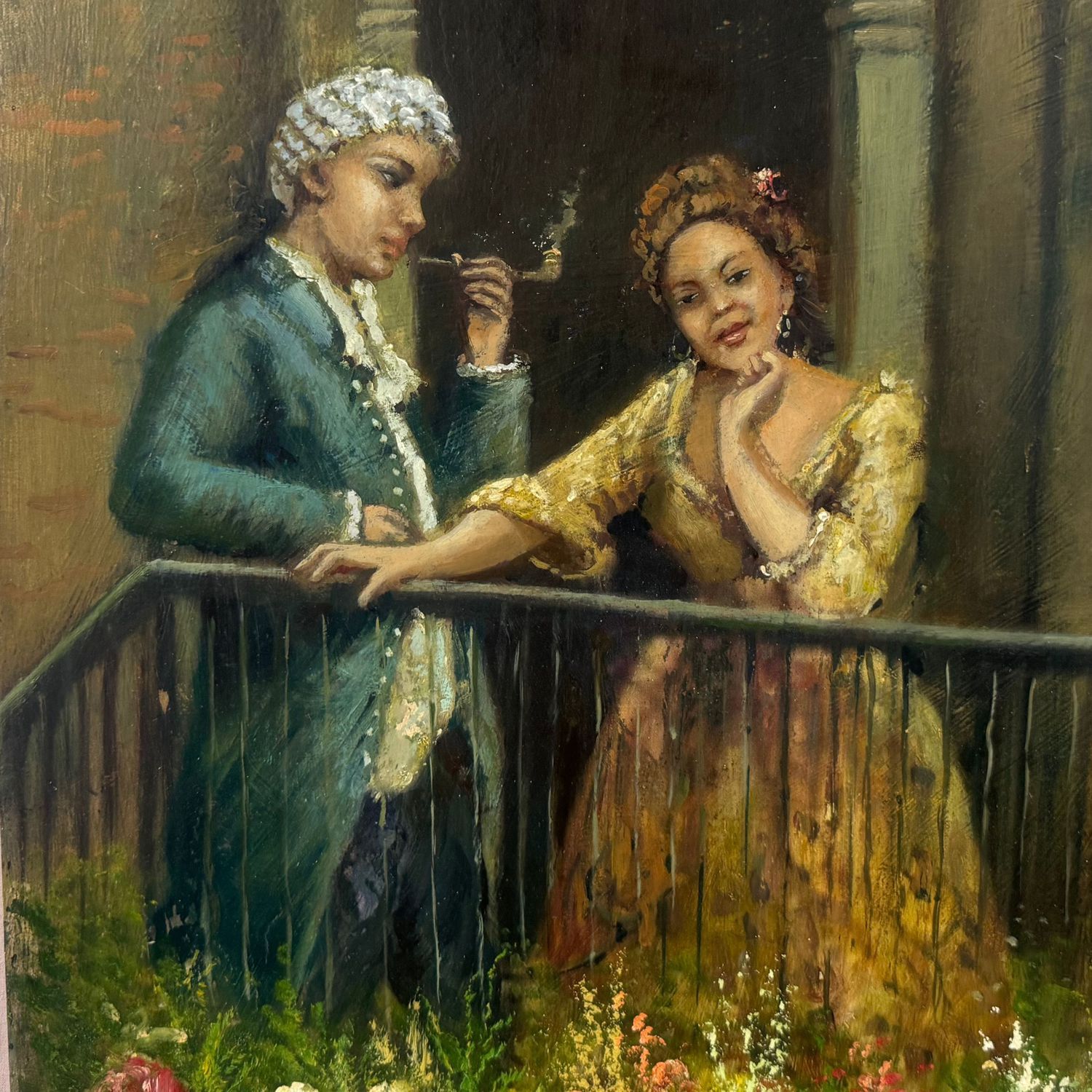 Dipinto olio su pannello, periodo XX secolo scuola Francese raffigurante Scena galante su balcone.