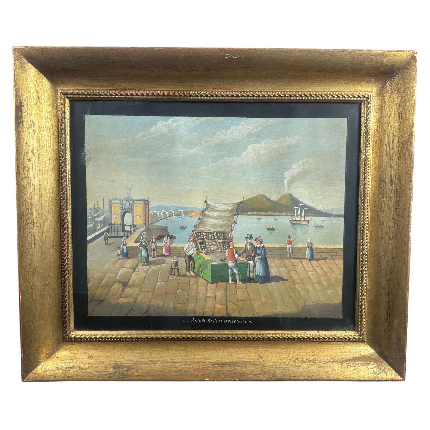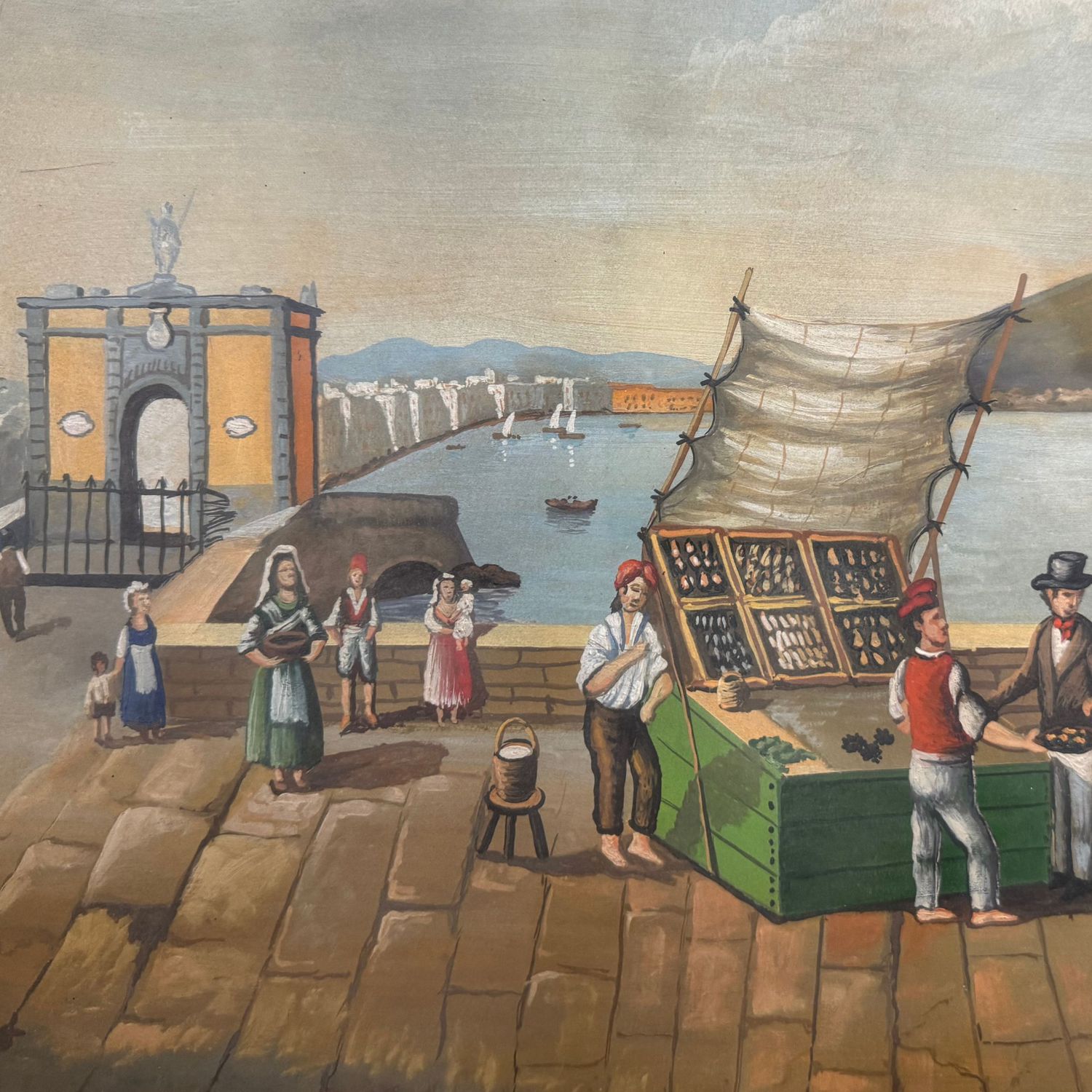 Dipinto guazzo (tempera su carta), periodo XX secolo scuola Italiana raffigurante Scorcio di Napoli con veduta del Vesuvio.