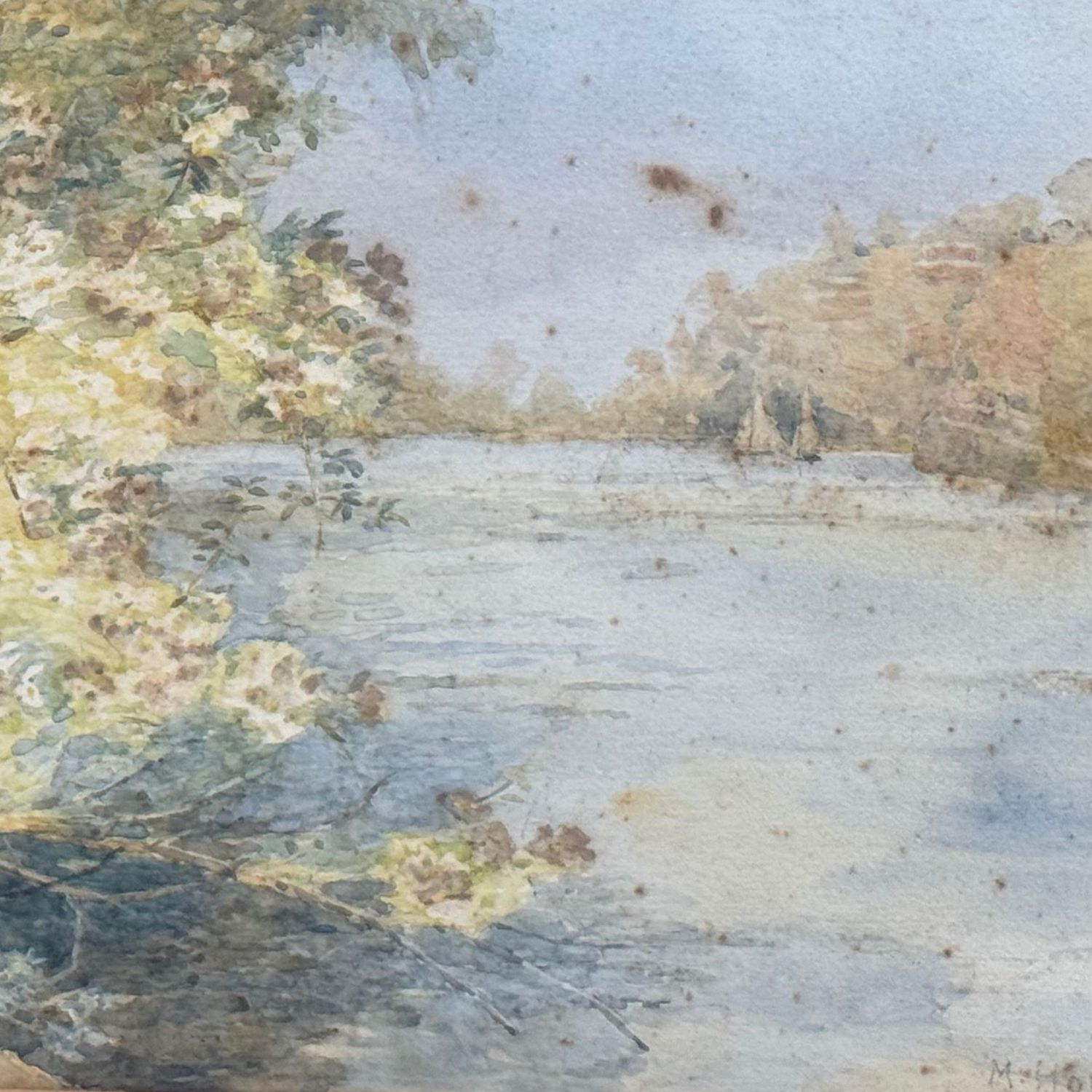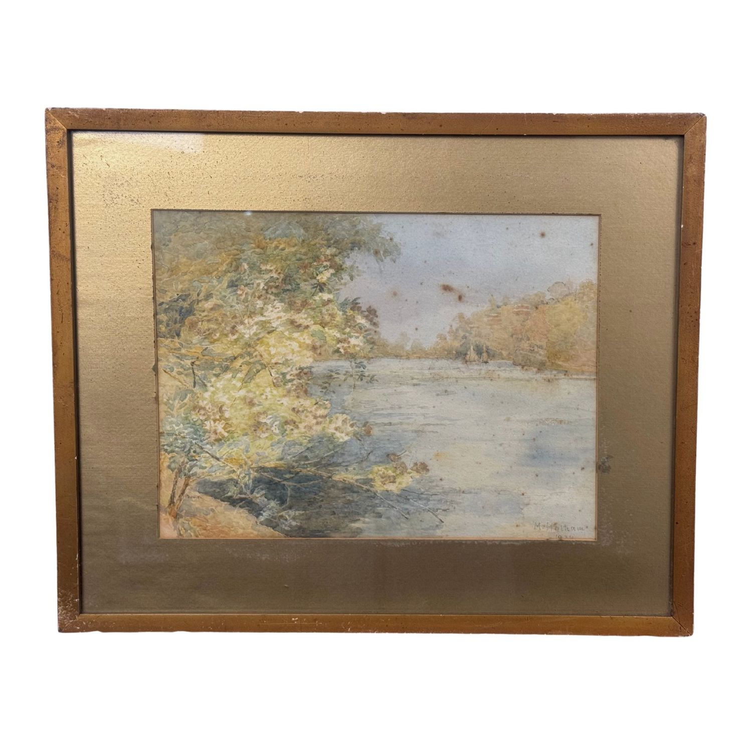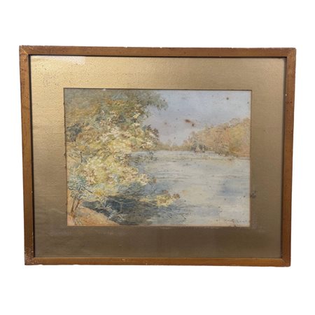 Dipinto acquerello, periodo XX secolo scuola Europea, raffigurante Paesaggio con lago (luogo imprecisato).