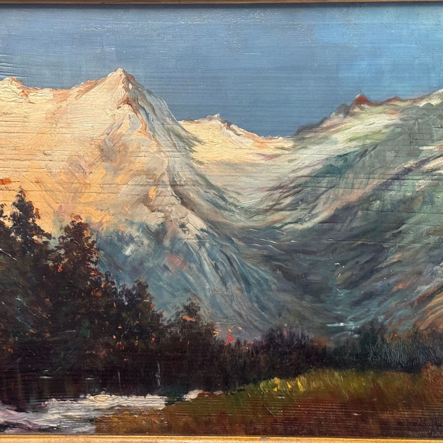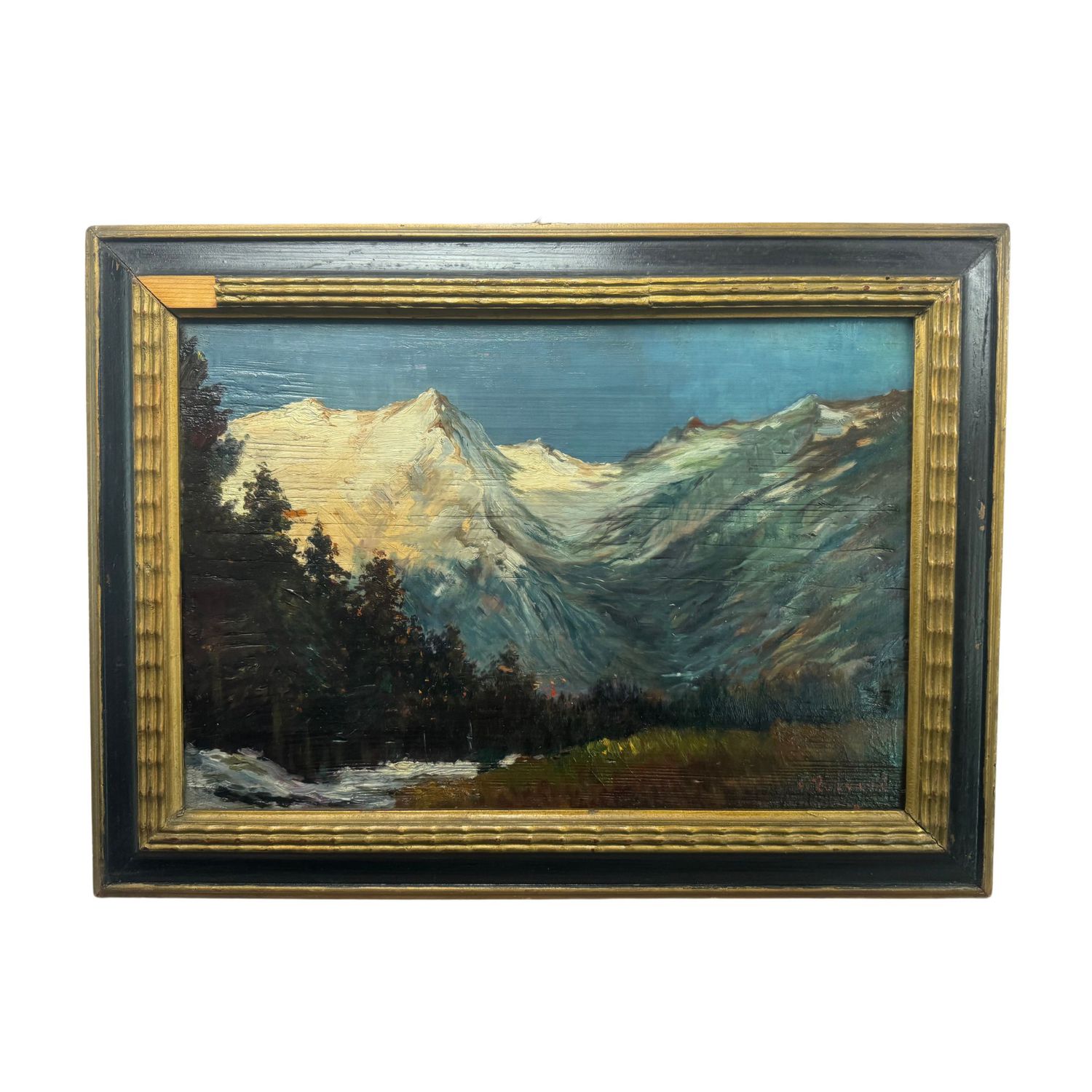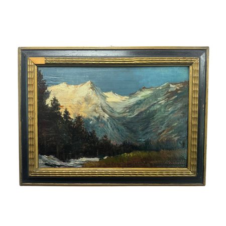 Dipinto olio su tavola, periodo XIX/XX secolo scuola Europea, raffigurante Montagne.