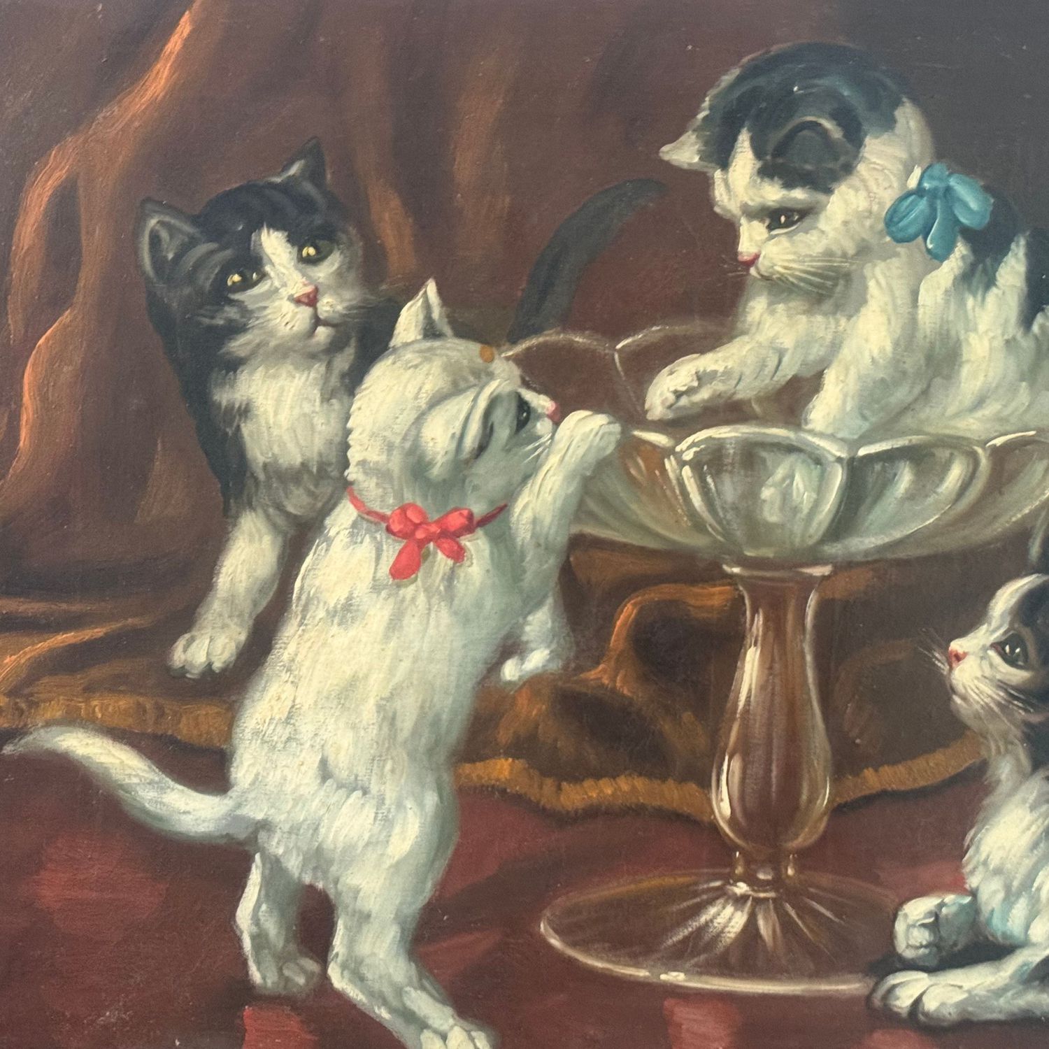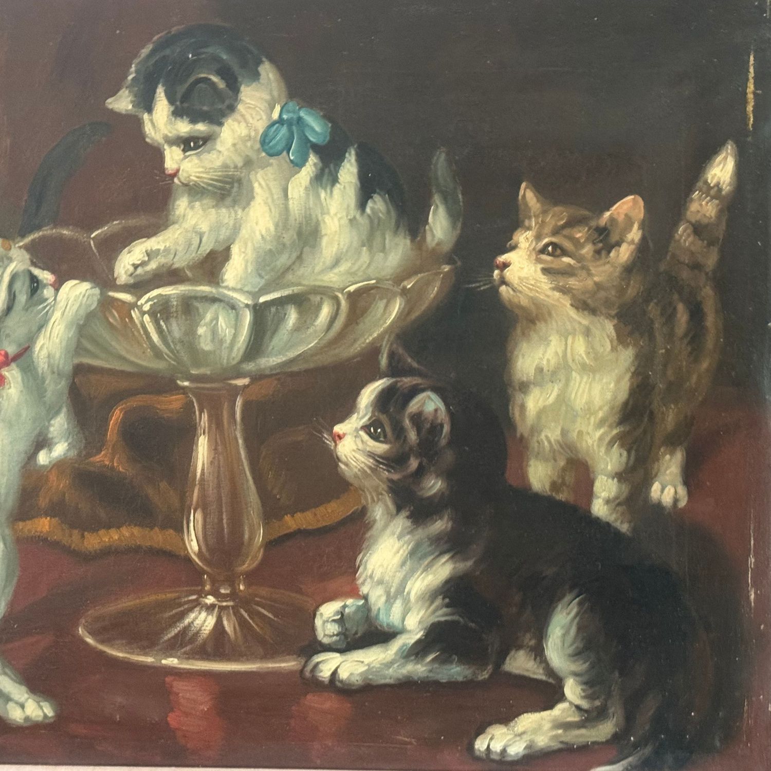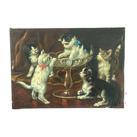 Dipinto olio su tela, periodo inizio XX secolo scuola Europea, raffigurante Allegoria di gatti.