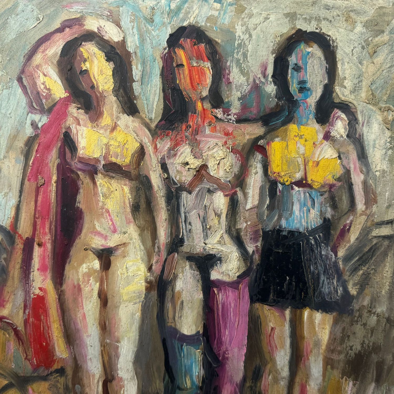 Dipinto tecnica mista su pannello, periodo XX secolo scuola italiana, raffigurante Tre donne.