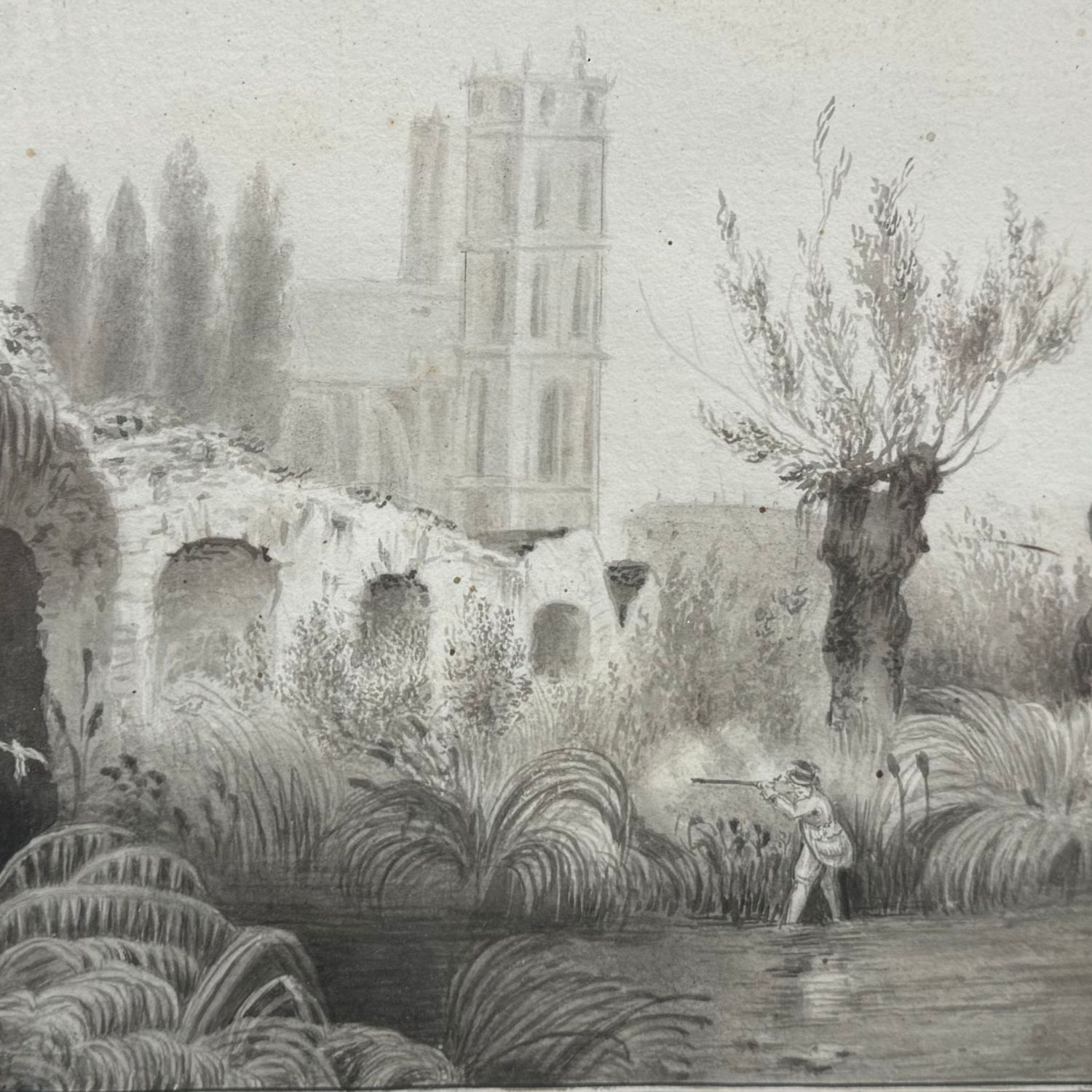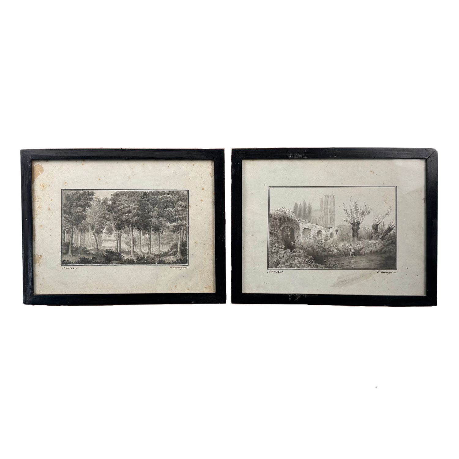 Coppia di dipinti su carta, periodo XIX secolo scuola Italiana, raffiguranti Paesaggi.