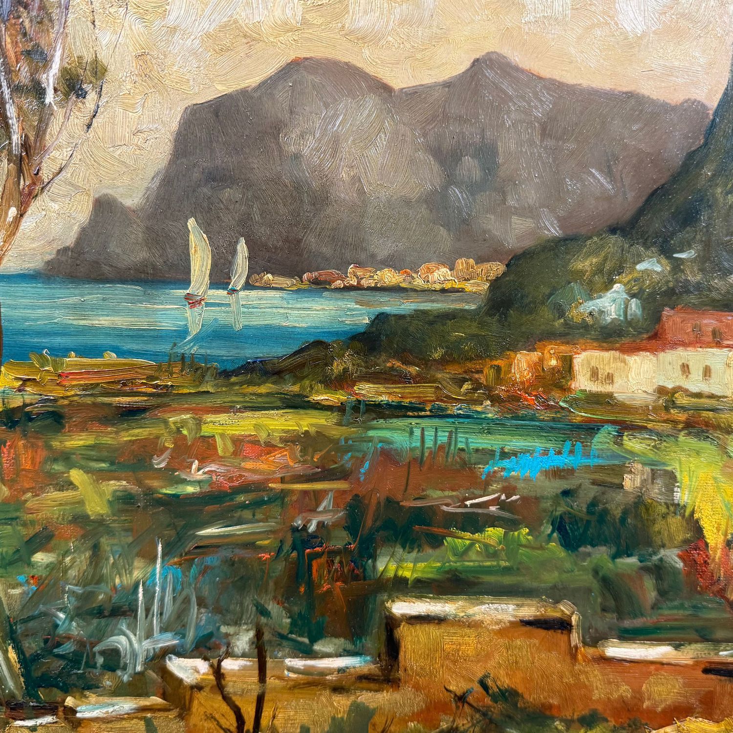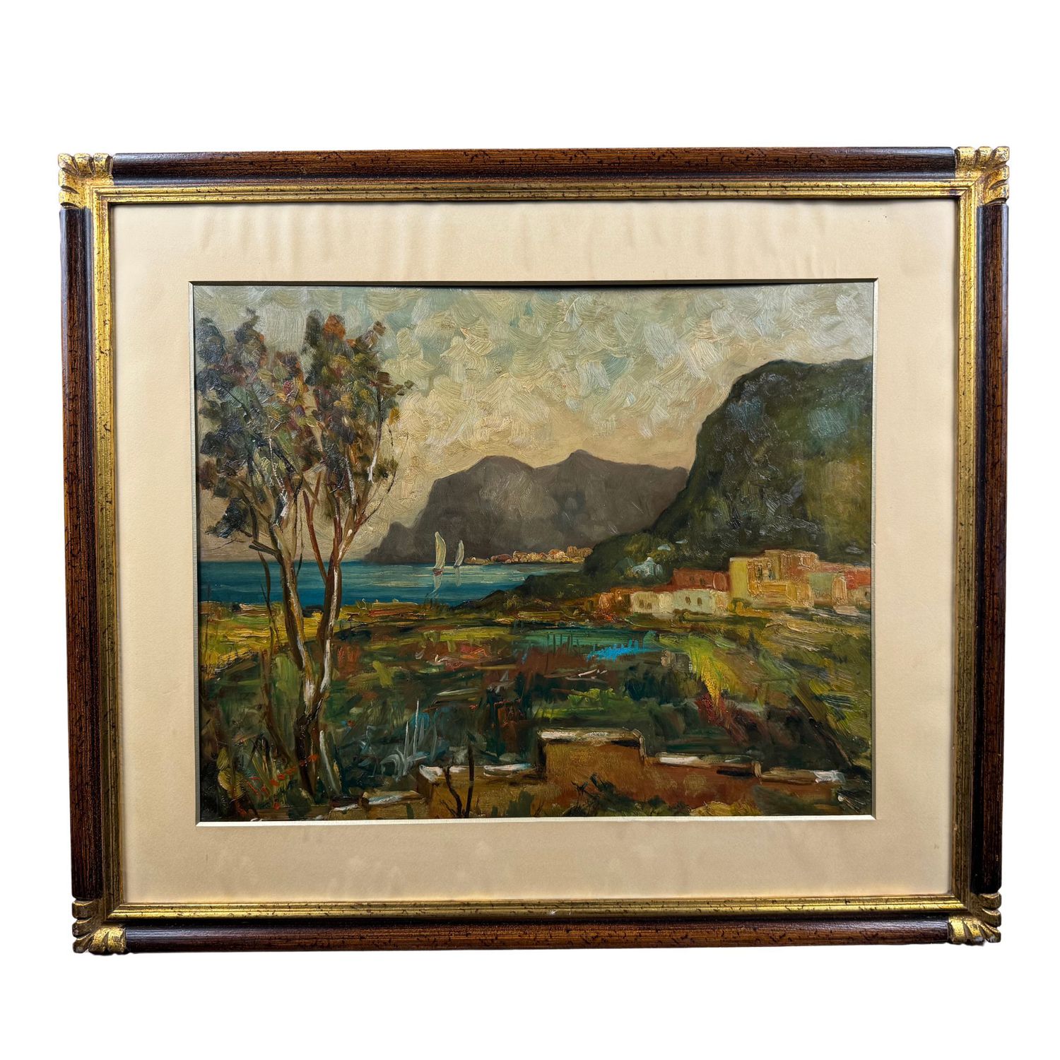 Dipinto olio su pannello, periodo XX secolo scuola Italiana, raffigurante Veduta di Costiera.