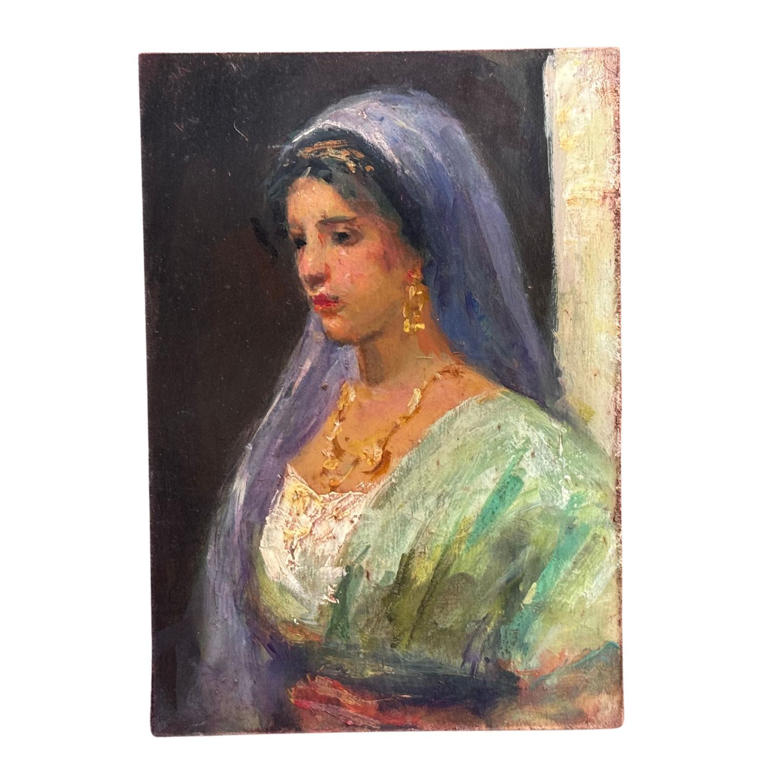 Piccolo dipinto olio su pannello, periodo XX secolo scuola Italiana, raffigurante Donna con turbante.
