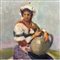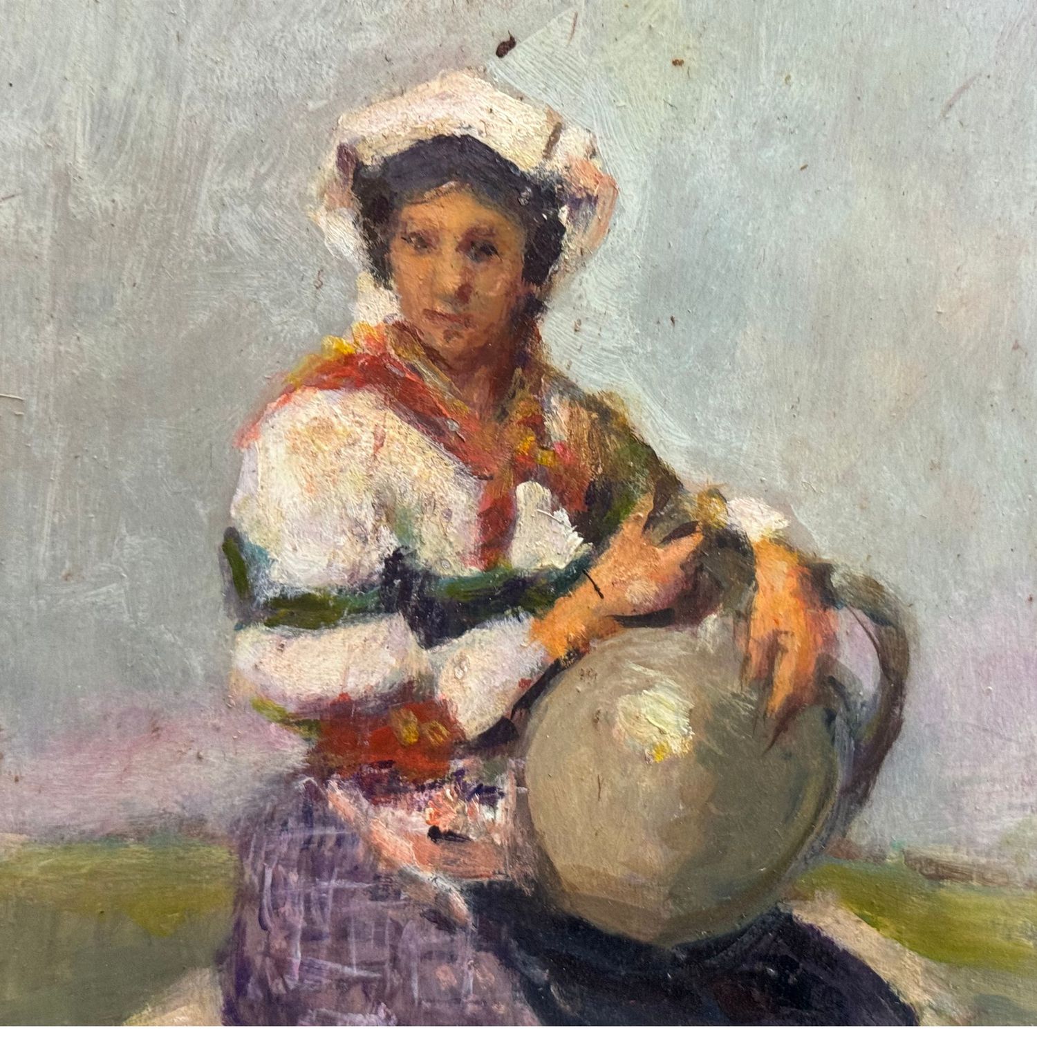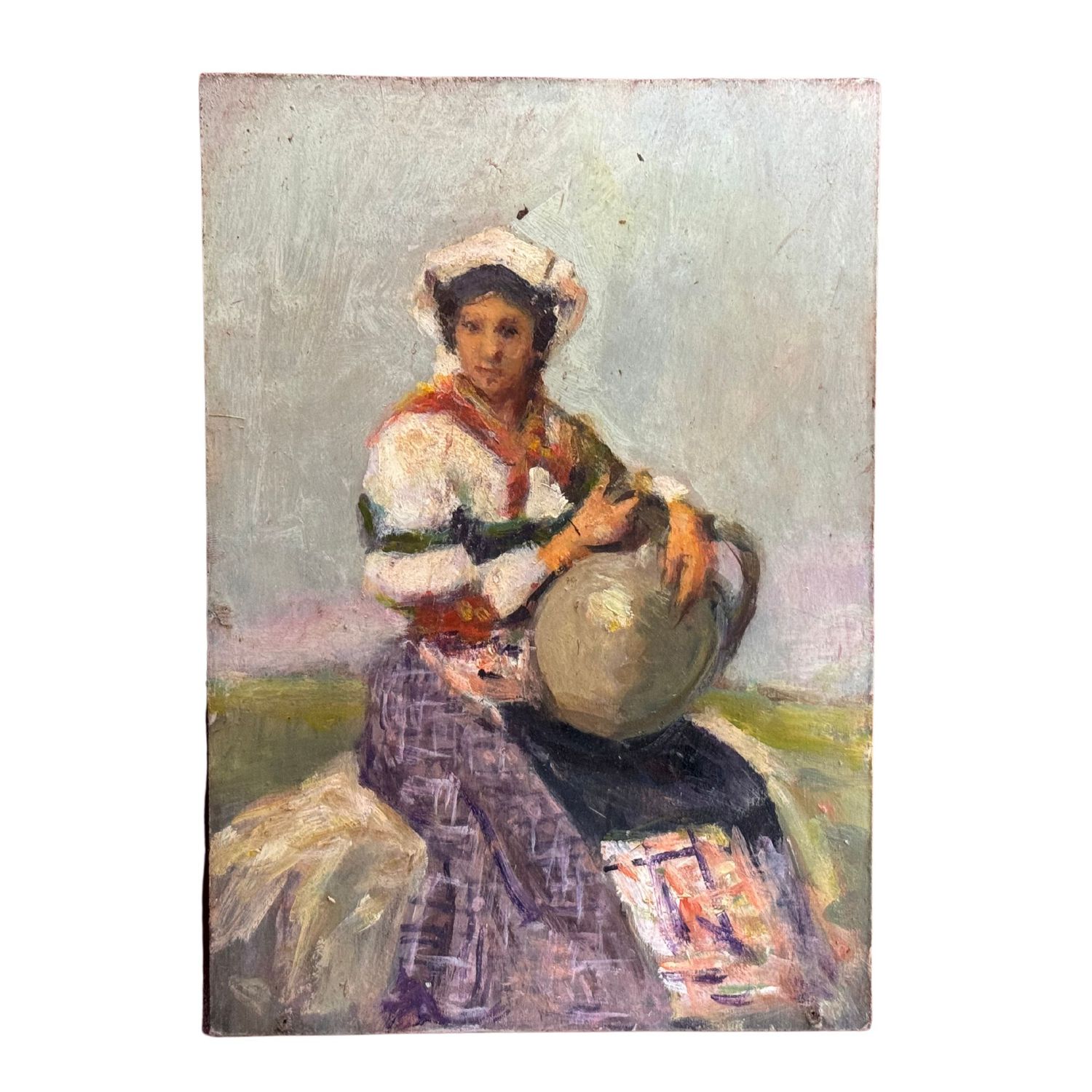 Piccolo dipinto olio su pannello, periodo XX secolo scuola Italiana, raffigurante Donna con brocca.