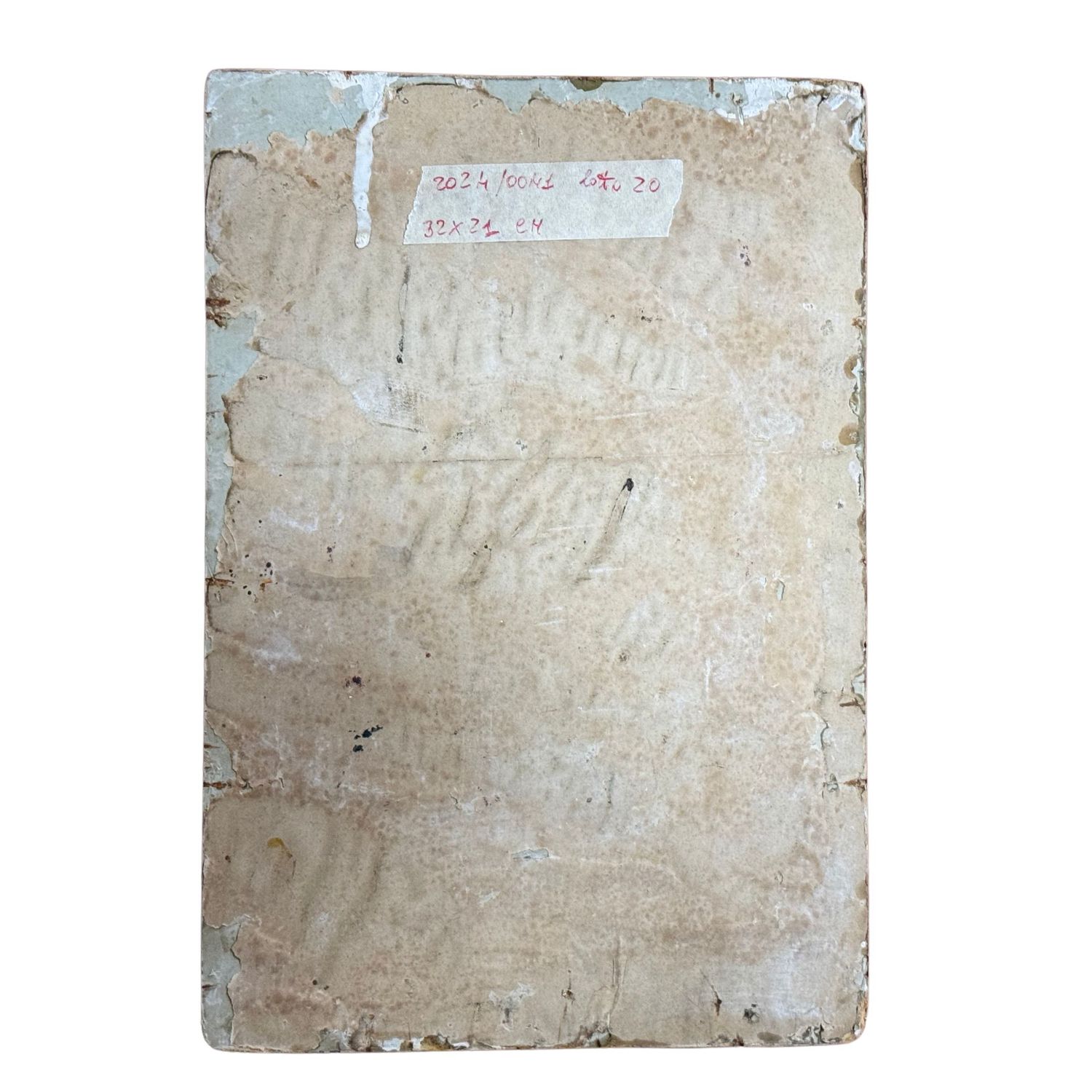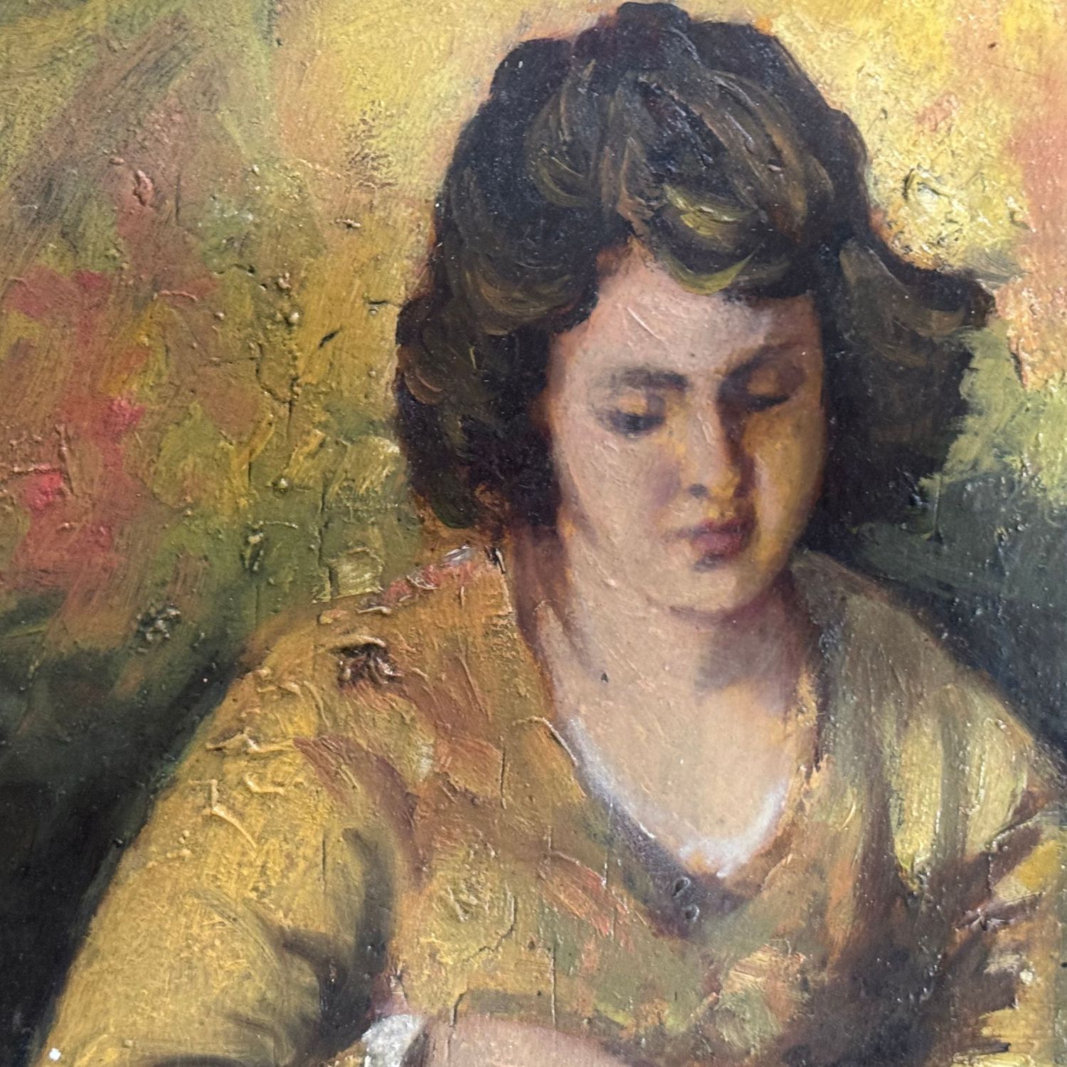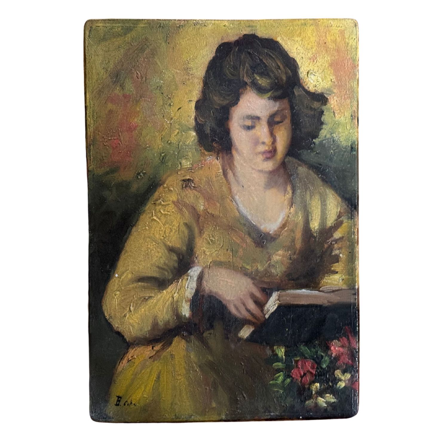 Piccolo dipinto olio su pannello, periodo XX secolo scuola Italiana, raffigurante Donna in lettura.