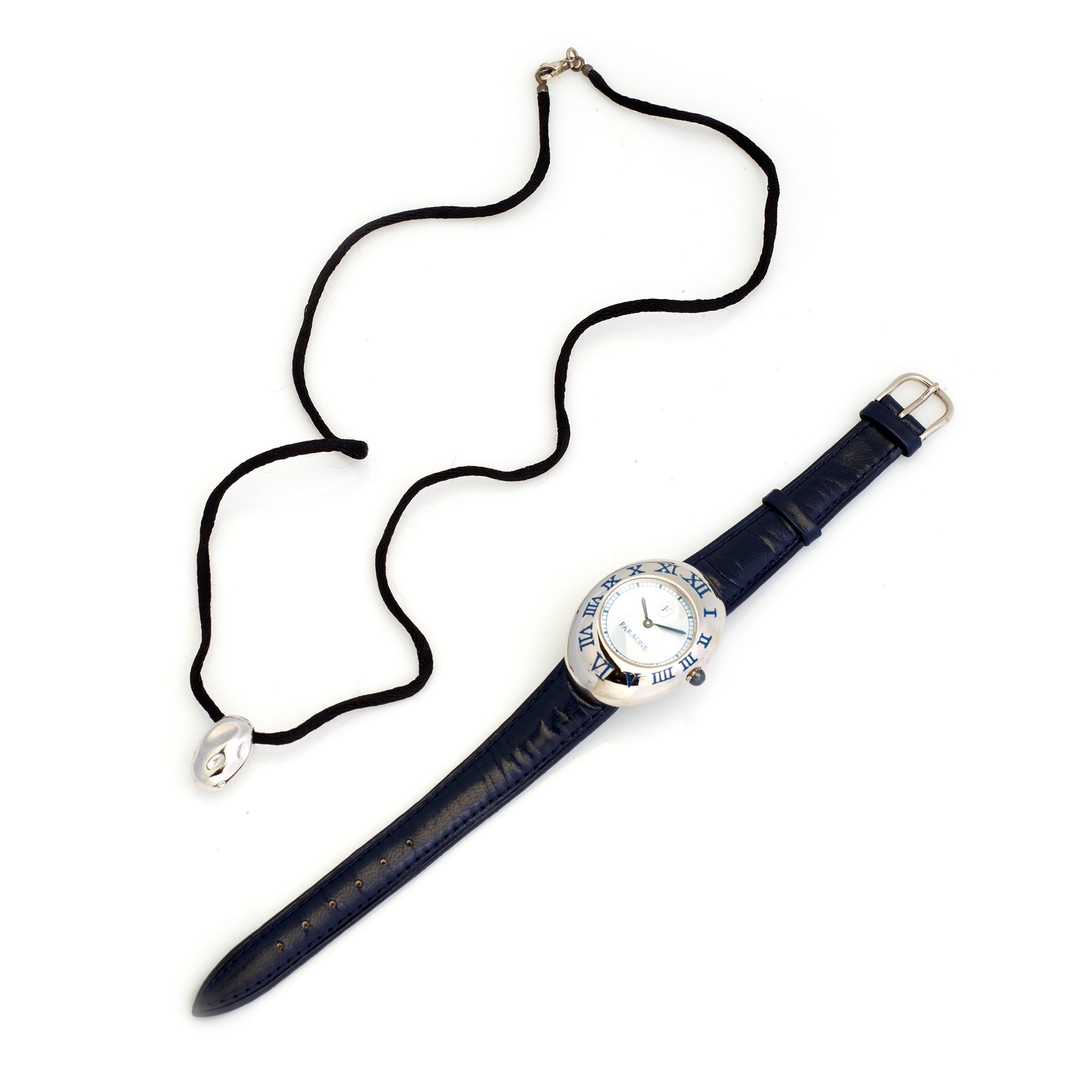 Orologio da polso Faraone con cassa in argento e cinturino in pelle blu con chiusura ad ardiglione, movimento al quarzo. Cassa e quadrante firmati. Come nuovo.