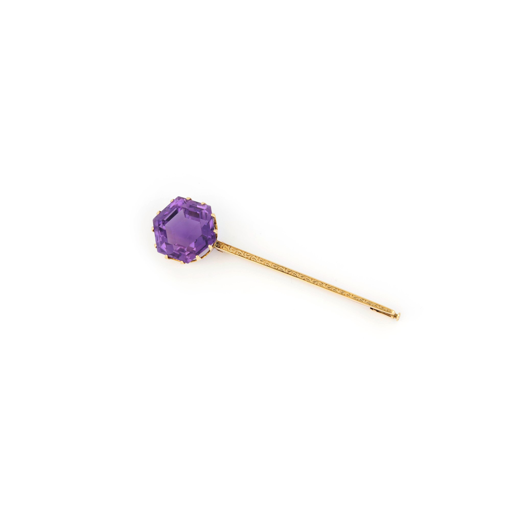 18 Kt yellow gold brooch with hexagonal amethyst