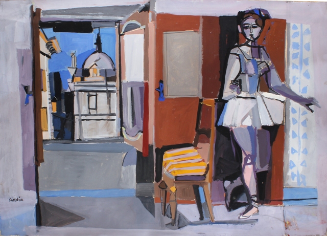 ANTONIO SCORDIA Santa Fè 1918 - Roma 1989 Donna in interno con scorcio di Roma dalla finestra, 1950 ca. Olio magro e tempera su carta, cm. 50 x 70 Firma in basso a sinistra