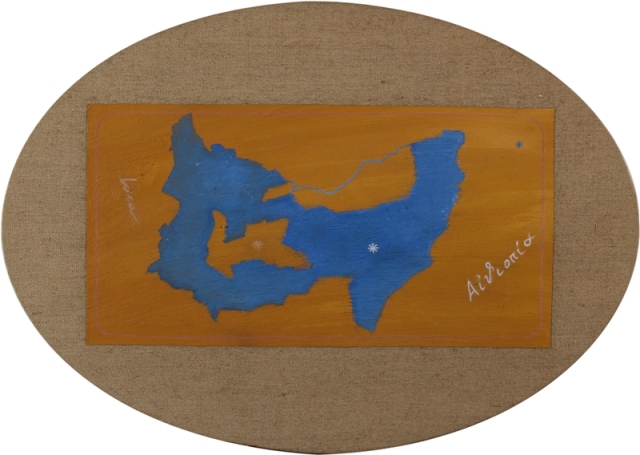 LUCA MARIA PATELLA Roma 1938 Aivlonio, 1980 Olio su cartoncino e tela applicata su masonite a sagoma ovale cm. 50 x 70 Titolo a destra Firma a sinistra