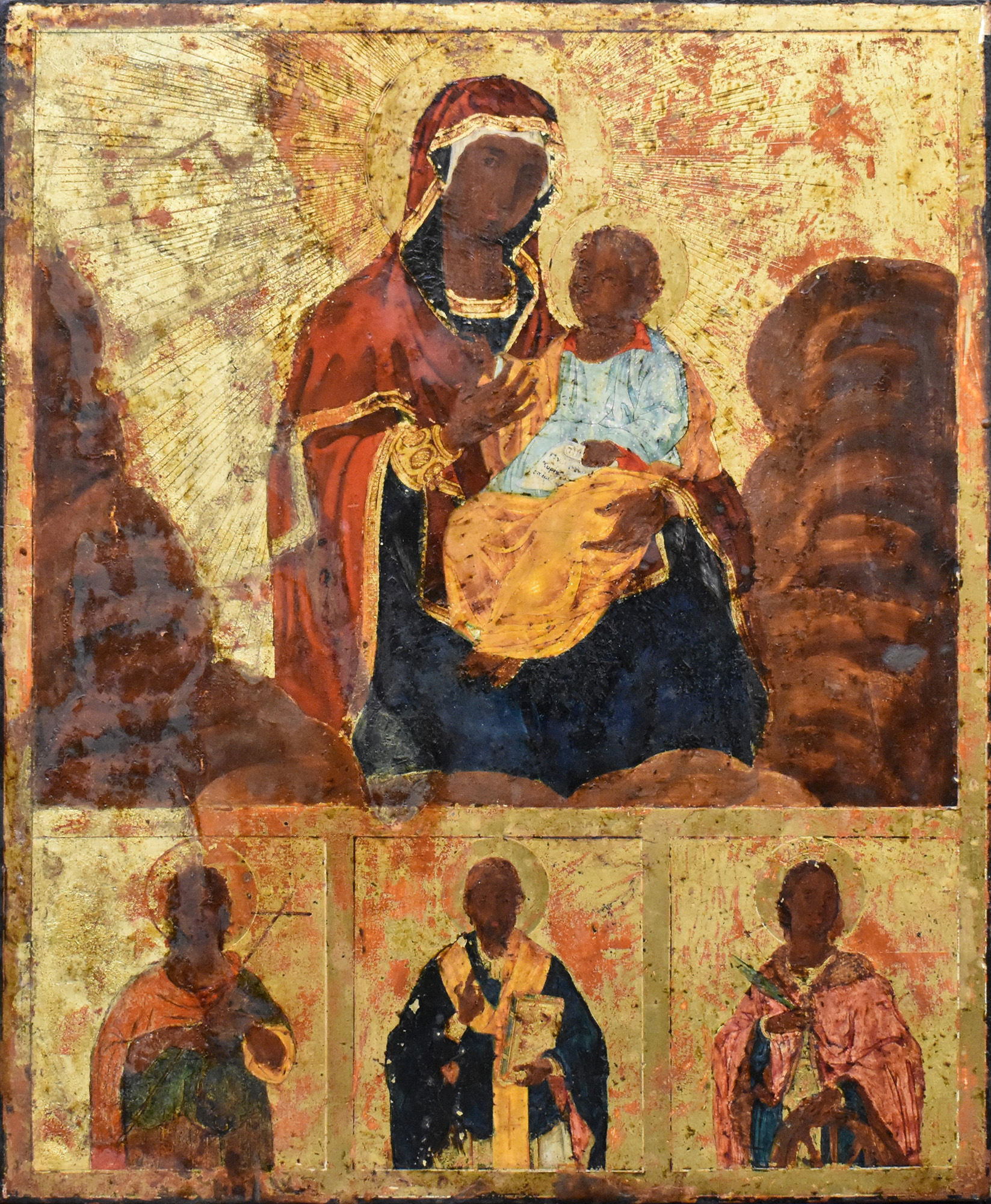Icona tempera all'uovo su tavola con fondo oro Madonna con Bambino e Santi sec XIX