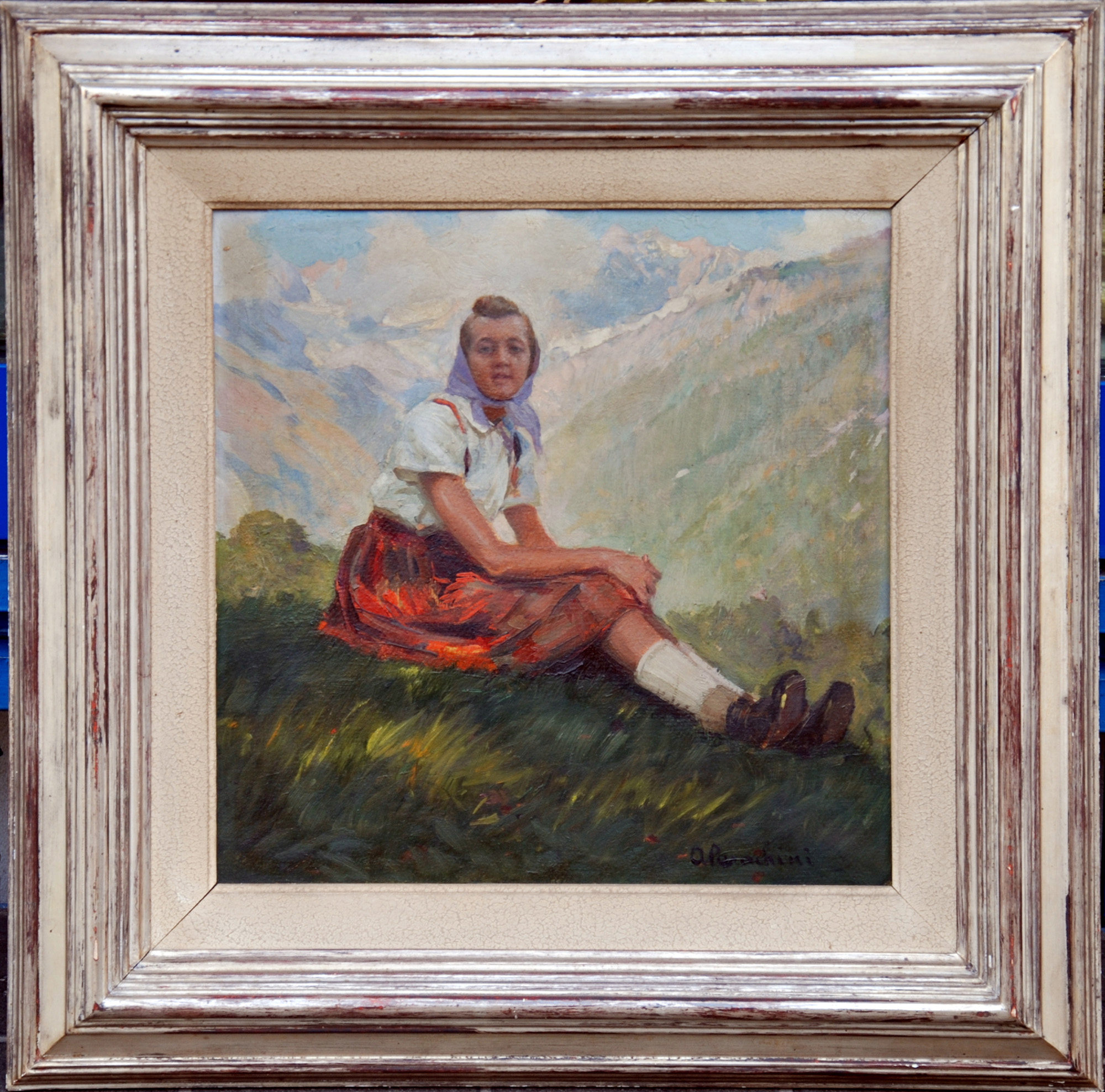 Achille Parachini 1888-1970 olio su cartone raff.ragazza sulle alpi