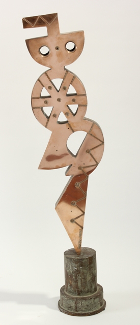UMBERTO MASTROIANNI Fontana Liri 1910 - Roma 1998 Totem, 1975 Sultura in bronzo a patina dorata, cm. 72 x 21 x 4,5 Misure con basetta cilindrica in bronzo eseguita dall'artista h. cm. 89 Firma in basso Esposizioni Arpino. Palazzo Ducale Boncompagni, 2012. Floriano de Santi a cura di. Catalogo mostra, p. 30