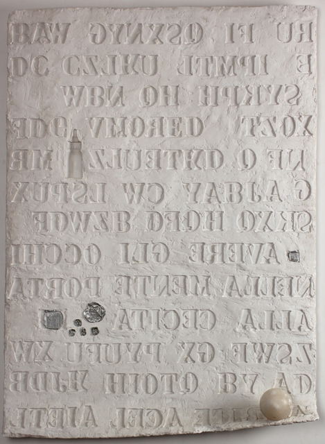 H.H. LIM Malaysia 1954 Senza titolo Scultura a foglio in bassorilievo in gesso con inclusioni in ferro e sfera in marmo nel basso, cm. 140 x 100 x 18 Firma, data e titolo al retro