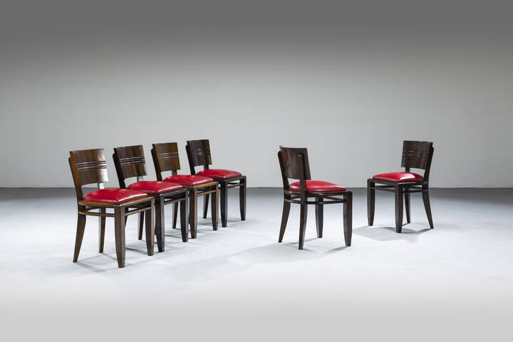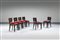 Struttura in legno impiallacciato verniciato, schienale in legno curvato e imbottitura rivestita in pelle.