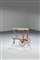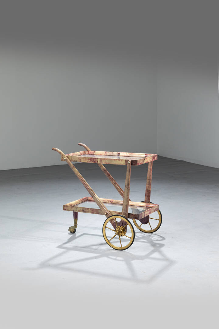 Carrello in legno foderato con pergamena invetriata, piani a vassoio in vetro, particolari in ottone.
