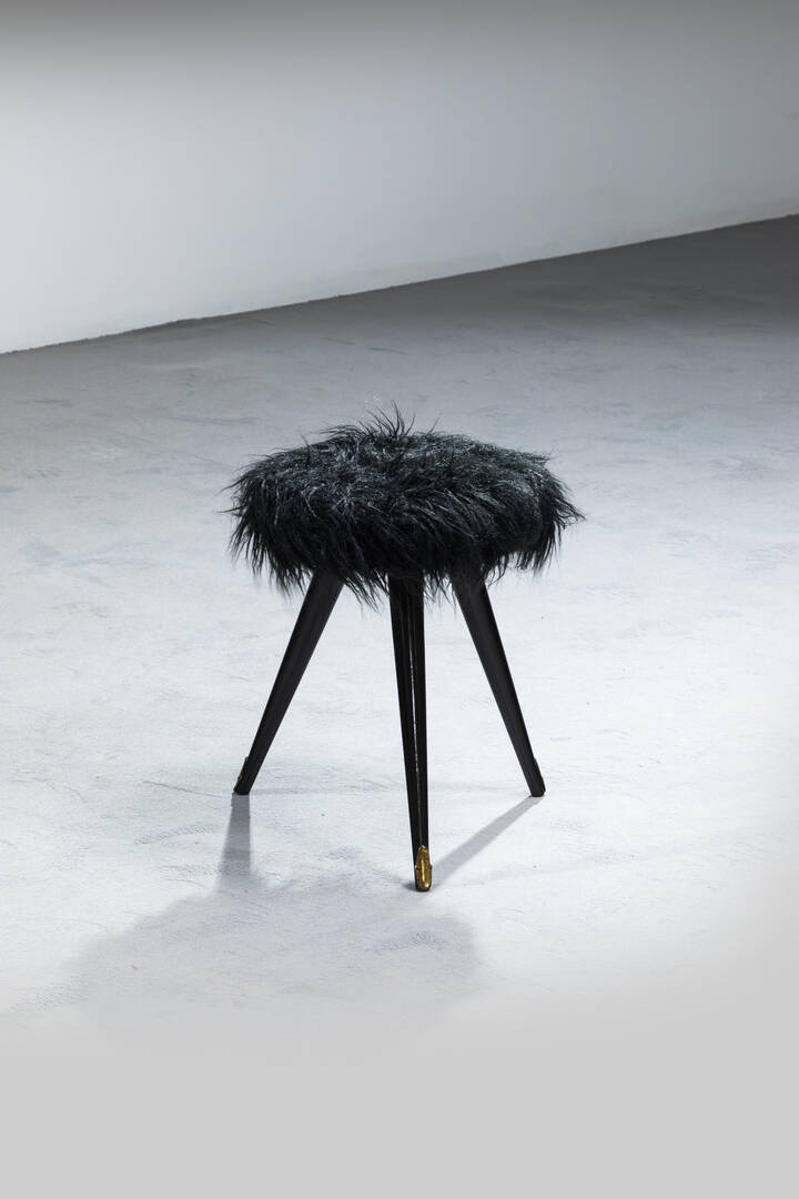 Struttura in legno, imbottitura rivestita in ecopelliccia e particolari in ottone.