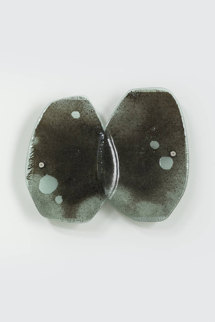 Vetro fuso con struttura metallica decorativa.
