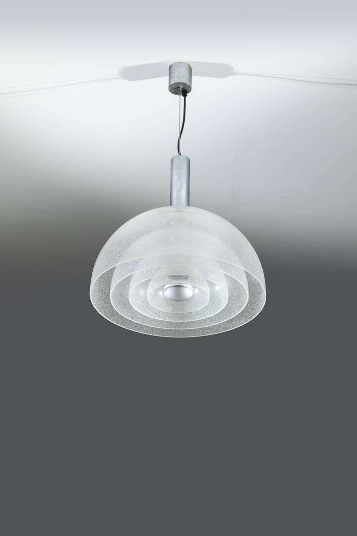 Metallo cromato, quattro coppe concentriche in vetro soffiato.