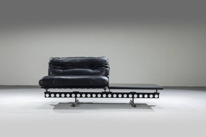 Divano con struttura e sostegni in metallo laccato, rivestimento in pelle, tavolino con struttura e sostegni in metallo laccato e piano in marmo .