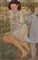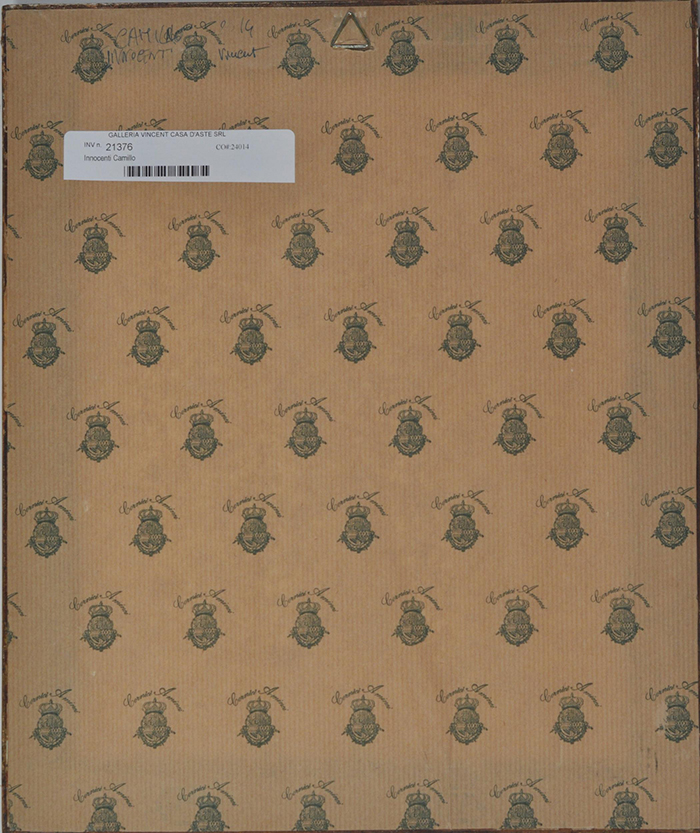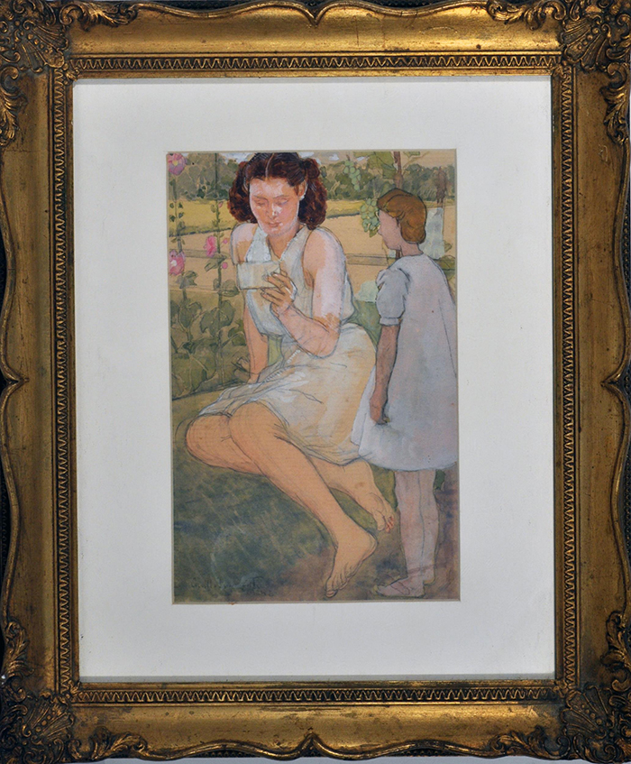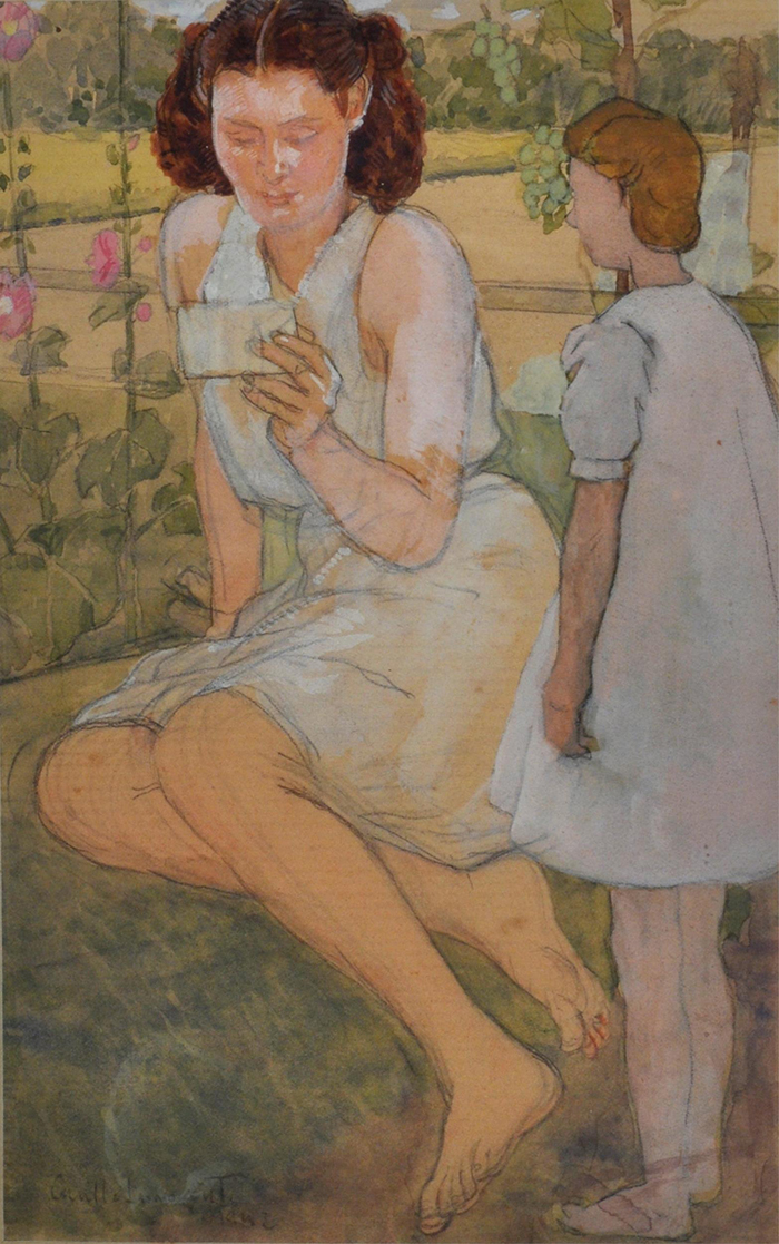 Innocenti Camillo (Roma, 1871 - 1961) Luisa in giardino con la bambina tecnica mista su carta, cm 22x14,5 firmato e datato in basso a sinistra: Camillo Innocenti 1942