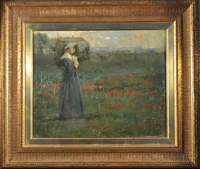 Postiglione Luca (Napoli 1876 - 1936) La crocerossina olio su tela, cm 32,5x 41 firmato in basso a sinistra: L. Postiglione a tergo iscritto: Bozzetto originale di Luca Postiglione per il suo quadro " La crocerossina della prima guerra mondiale" premiato con la medaglia d'oro.