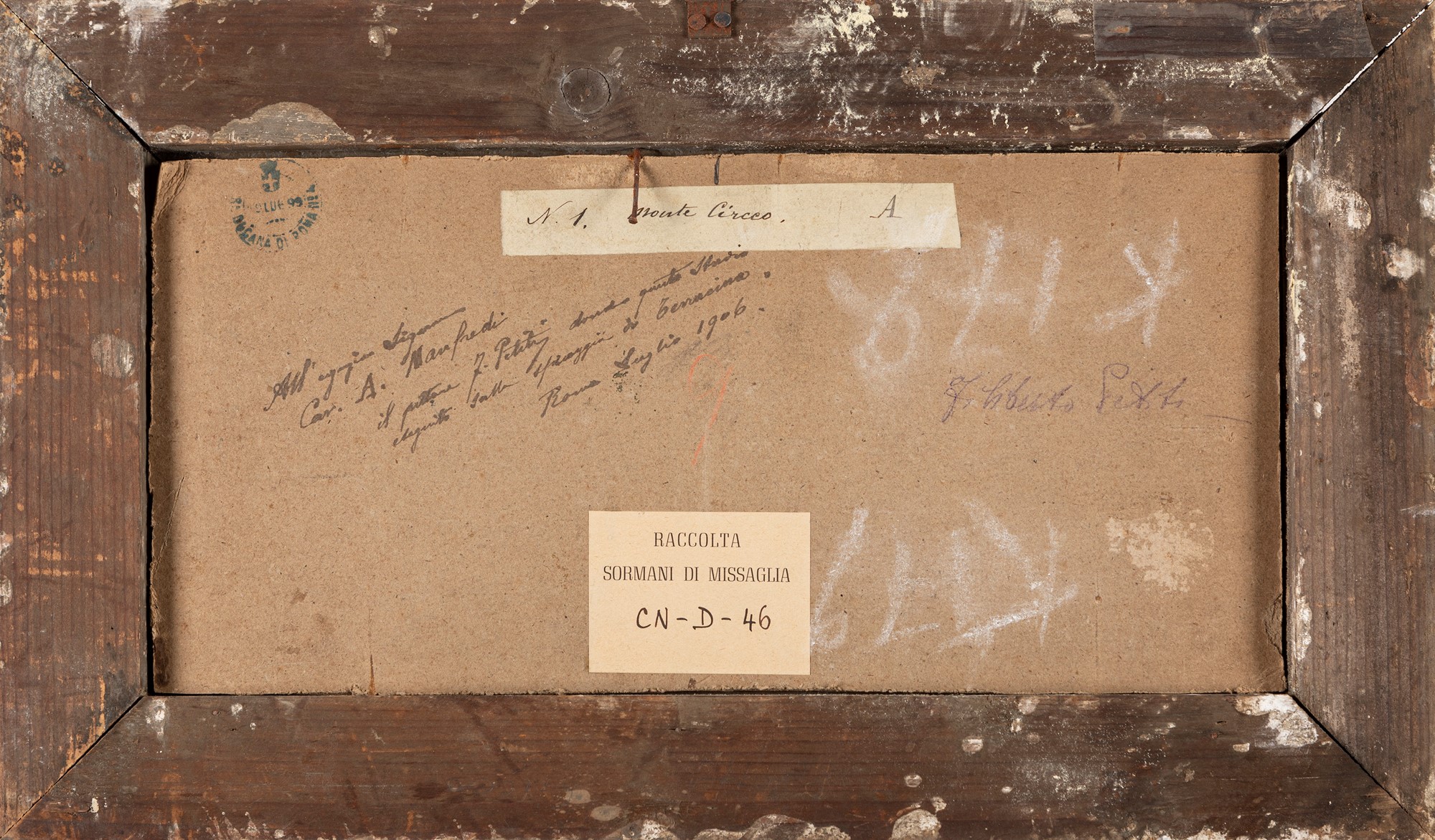 al retro, sul cartone, firmato, dedicato e datato 1906; etichetta del pittore con il titolo ed etichetta relativa alla provenienza (Sormani di Missaglia)