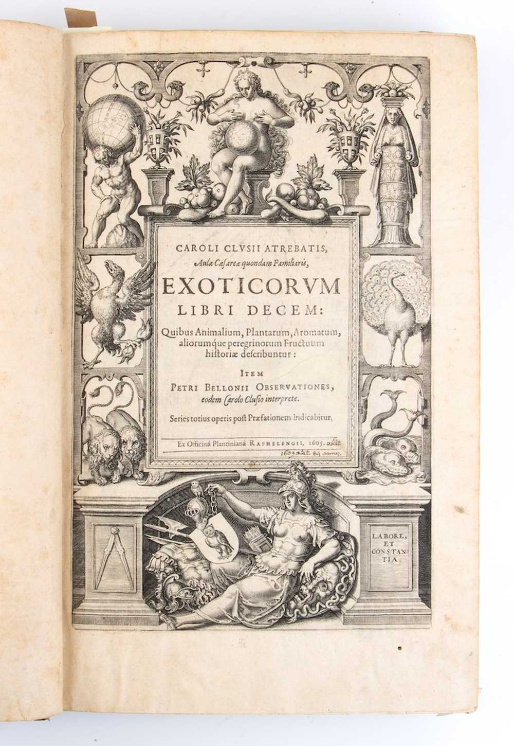 CLUSIUS CAROLUS. Exoticorum libri decem, quibus animalium, plantarum, aromatum, aliorumque peregrinorum fructuum historiae describuntur. Item Petri Bellonii Observationes, eodem Carolo Clusio interprete. 1605