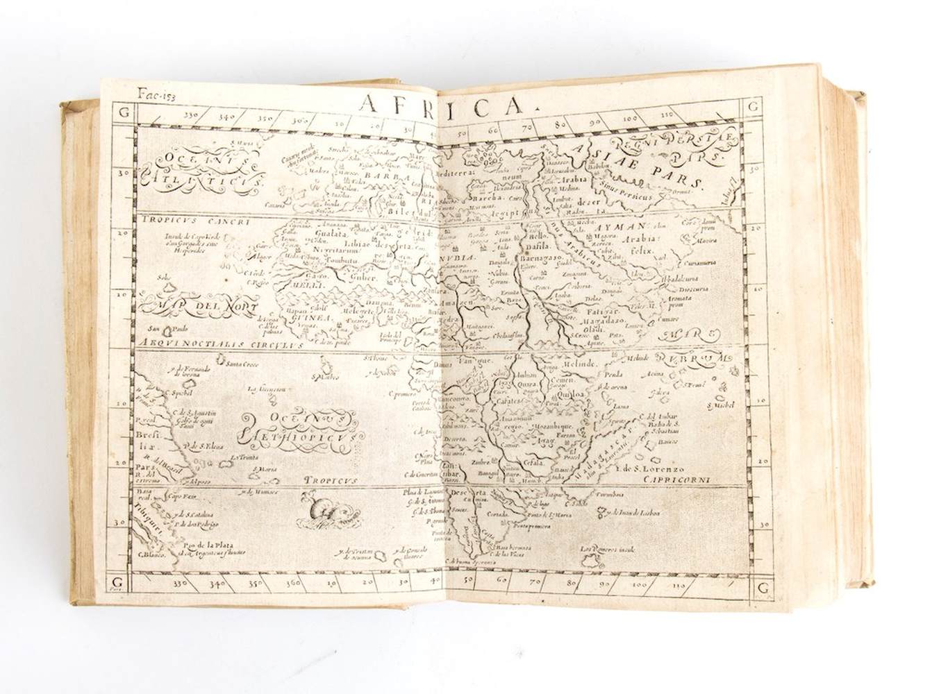 Copia genuina di questo trattato di geografia mondiale, originariamente pubblicato nel 1596-96. In questa edizione le pagine 193-240 nella prima parte e tutta la quarta trattano del Nuovo Mondo