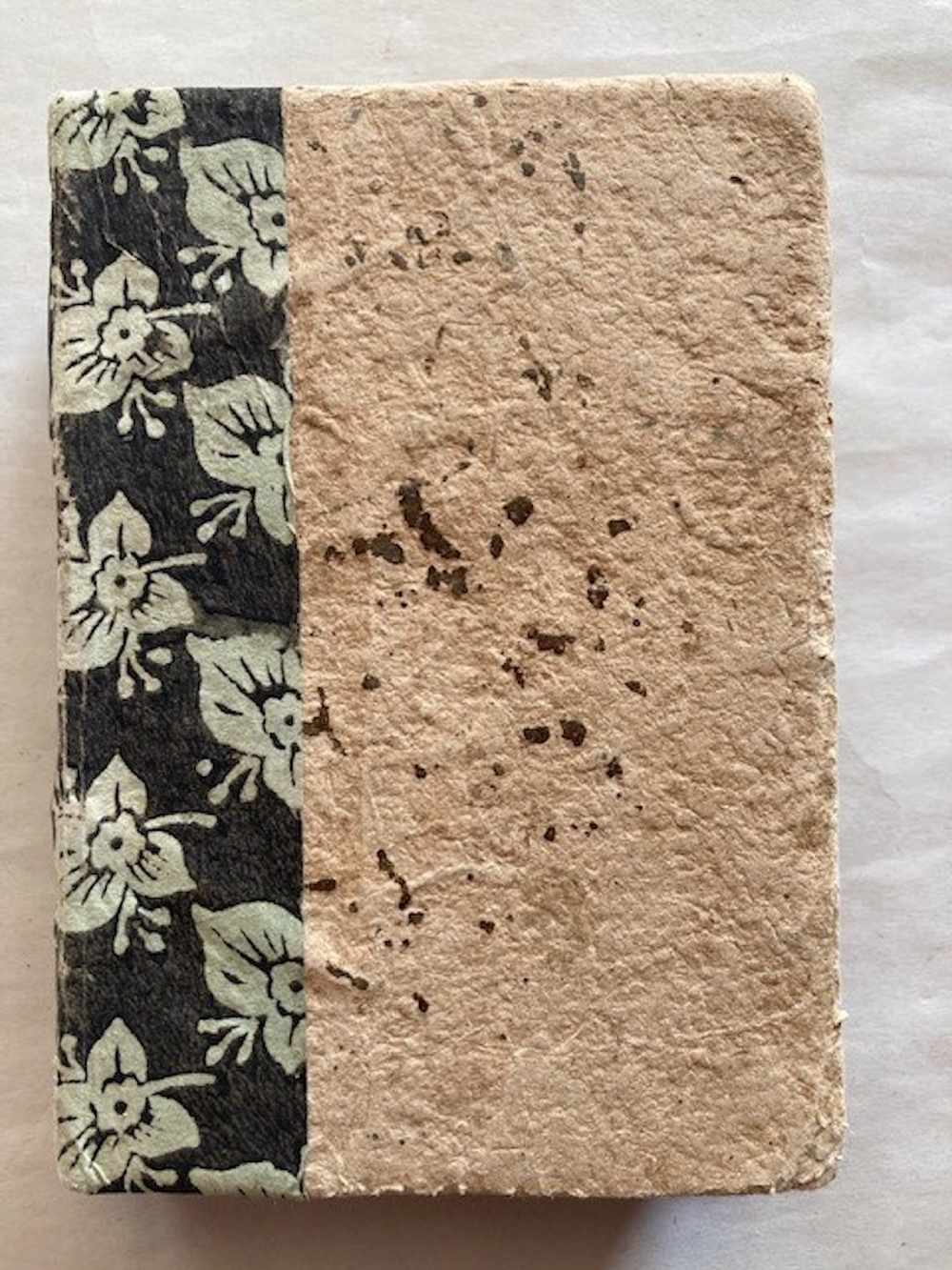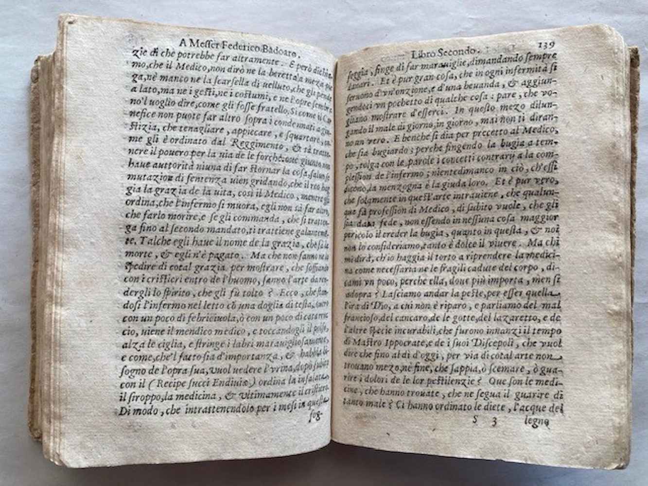 In 8° (il foglio 143x95 mm), cartone veneziano coevo a carta rustica, dorso rivestito successivamente da carta colorata, carte di guardia con frammenti presumibilmente seicenteschi, edizione dell'opera di Della Porta sulla Fisiognomica, complessivamente copia autentica (6 fogli ancora non aperti). Piccola marca xilografica sulla copertina, pp. [6], 256 [i.e. 258, la prima numerato erroneamente 5, come citato dalla SBN italiana].