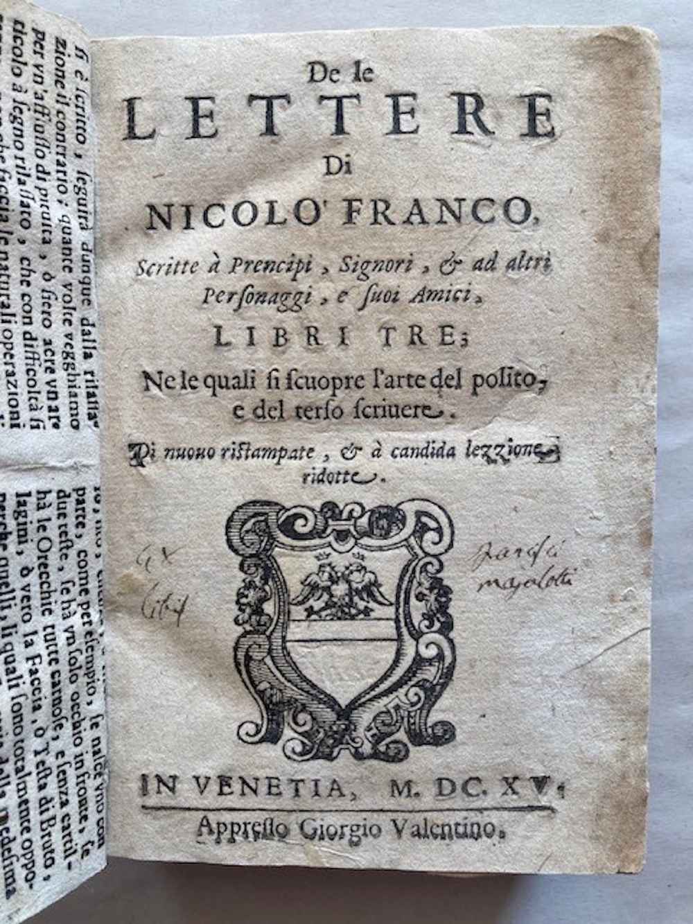 FRANCO, NICCOLÒ (1515-1570). De le lettere di Nicolo' Franco, scritte à prencipi, signori, & ad altri personaggi, e suoi amici, libri tre; ne le quali si scuopre l’arte del polito, e del terso scrivere. In Venetia: appresso Giorgio Valentino, 1615.