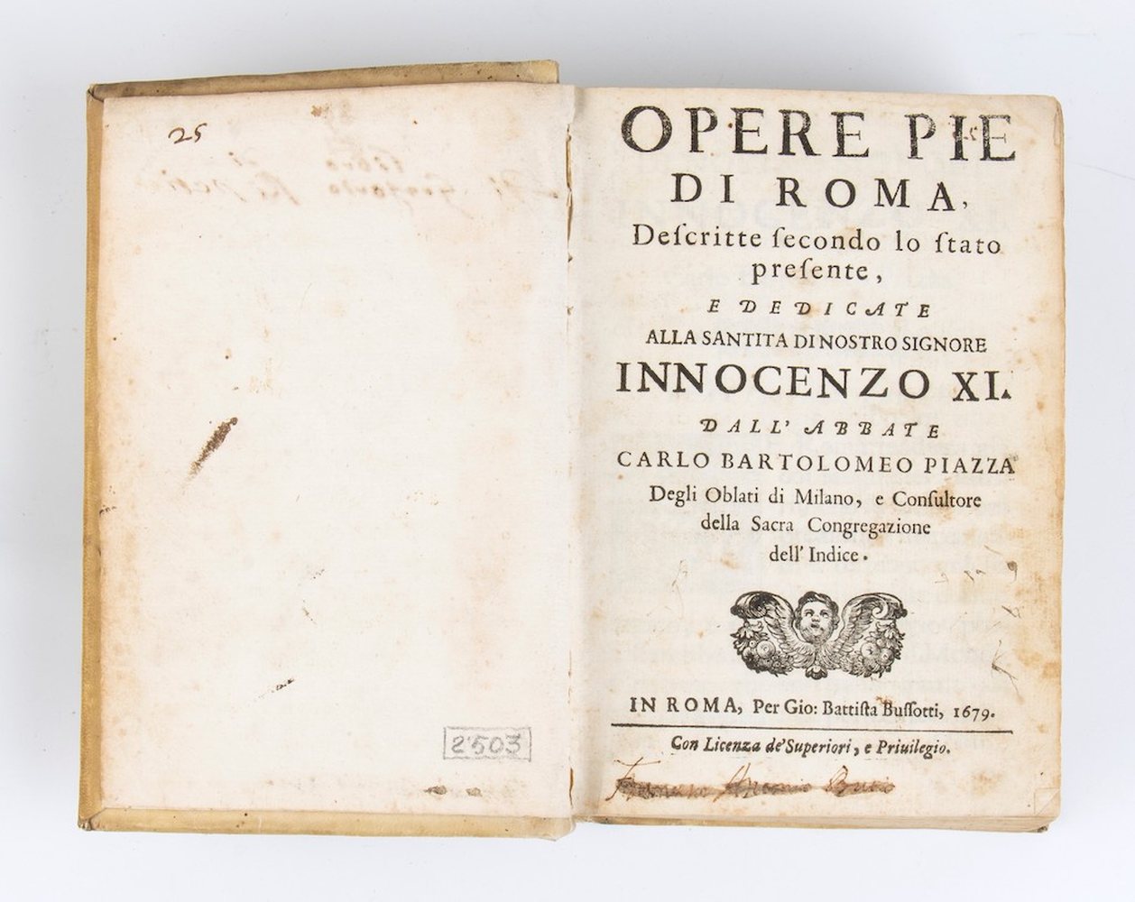 Edizione originale ed opera di grande interesse per la conoscenza di tutte le opere pie presenti in Roma, con descrizione minuziosa di ospedali pubblici e nazionali, donne penitenti e fanciulle, seminari e collegi, arciconfraternite, compagnie universali. Un capitolo intero dedicato a cuochi, vignaioli, mercanti, librai ecc ecc