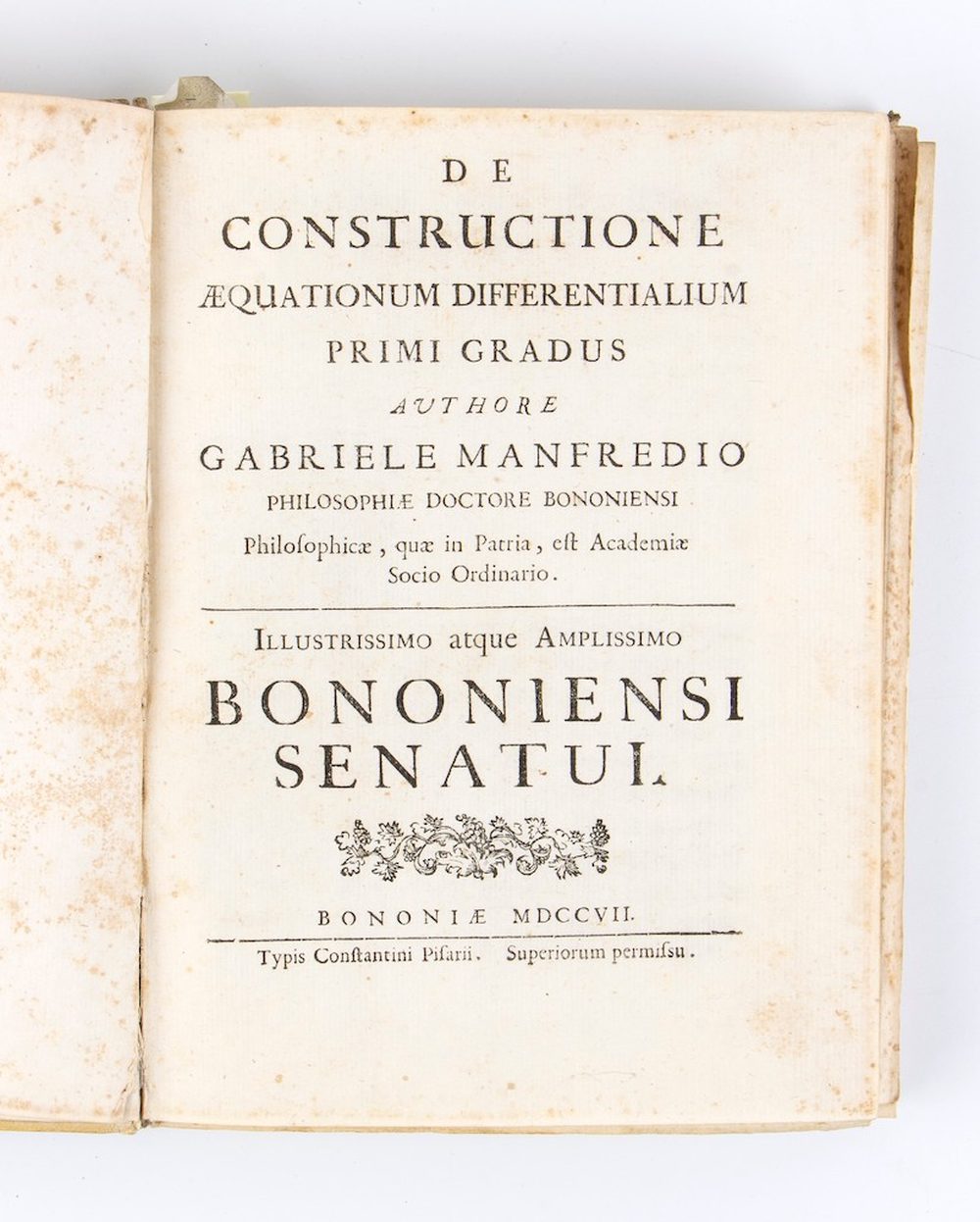 MANFREDI GABRIELE. De constructione aequationum differentialium primi gradus. Bologna 1707