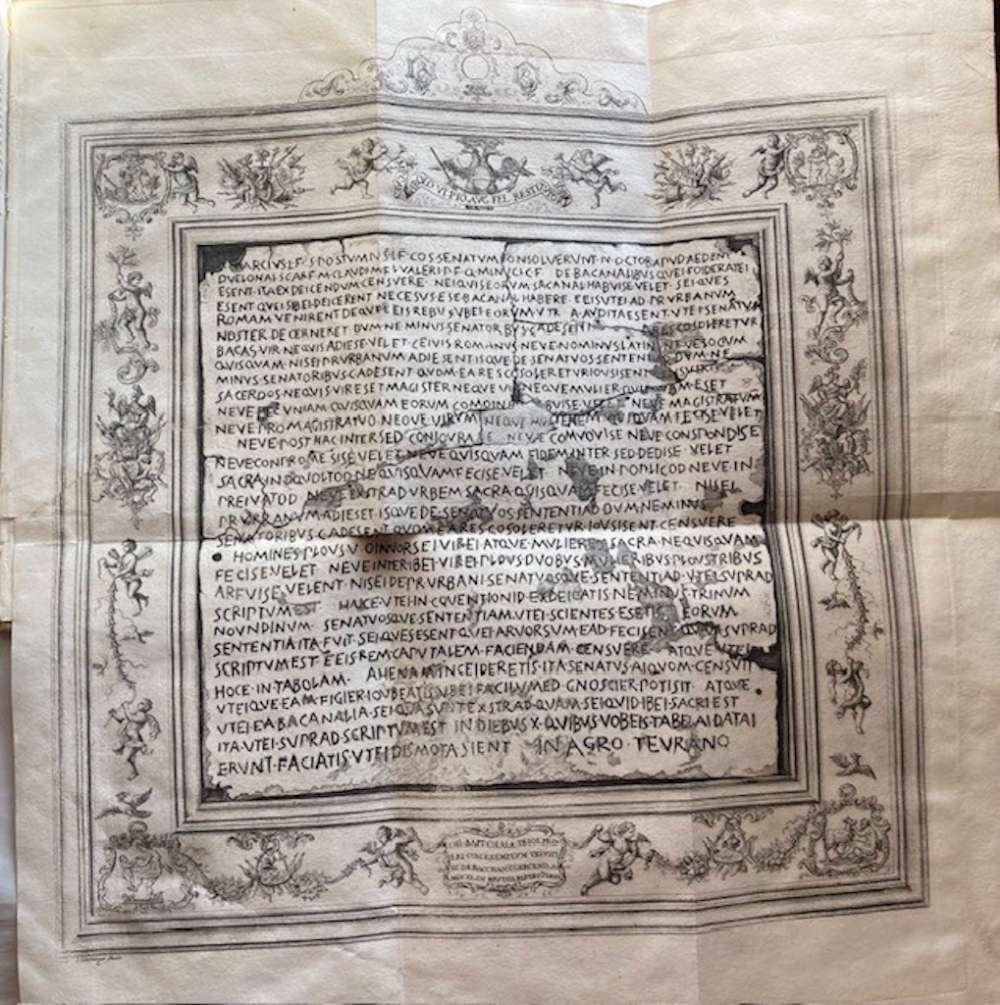 Prima edizione. Ottimo esemplare fresco e marginoso di questo trattato sulla famosa epigrafe bronzea di epoca romana contenente un editto del 186 dopo Cristo che proibisce le feste e i riti dedicati al dio del vino, i cosiddetti Baccanali.