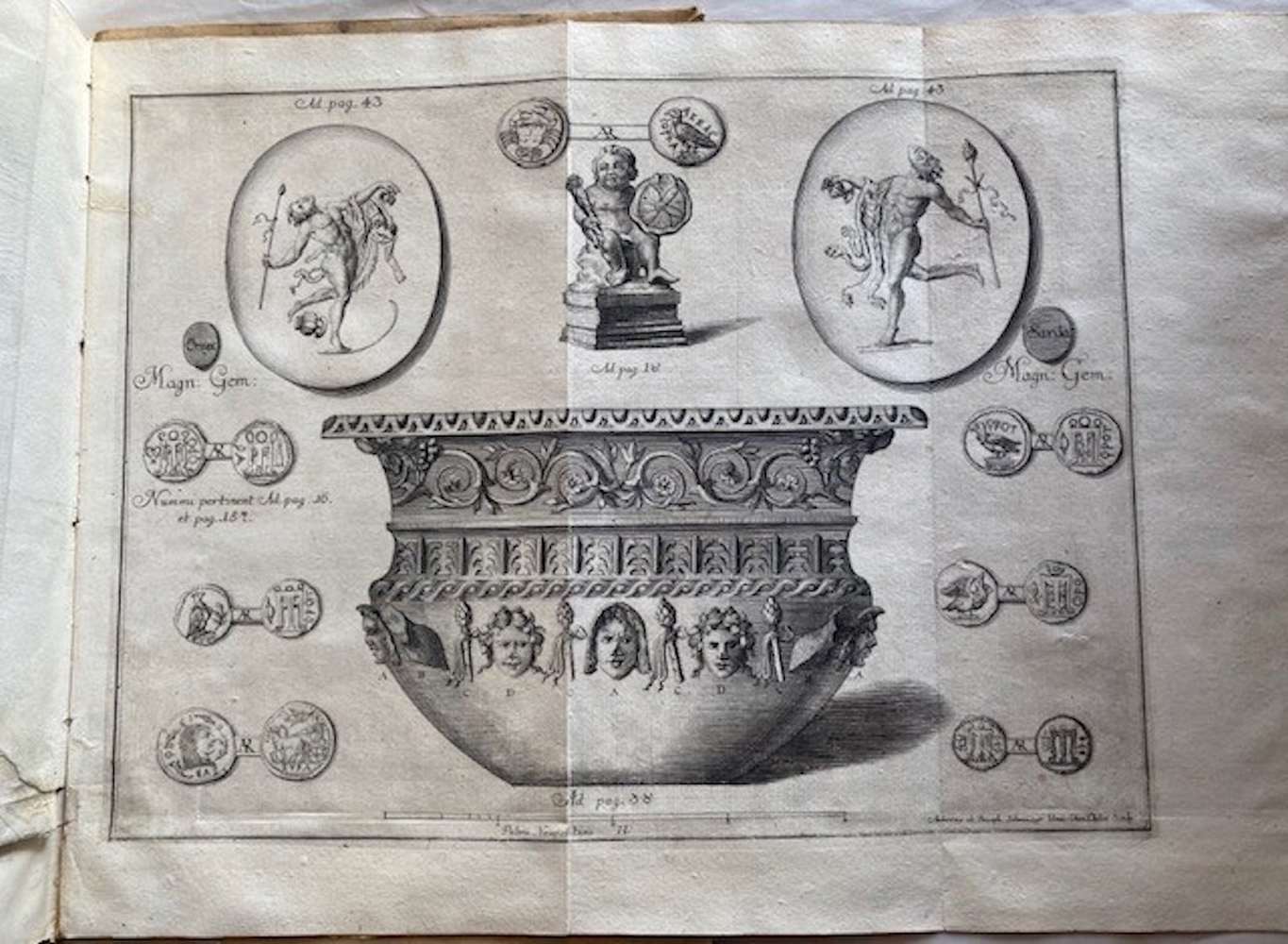 Folio (316 x 213 mm), bell’esemplare in piena pergamena coeva con titolo impresso in oro al dorso. Pp. [4], iiij, 221, [1], frontespizio a caratteri rossi e neri con grande vignetta incisa, 2 grandi tavole ripiegate incise da Andreas e Joseph Schmuzer in fine volume.