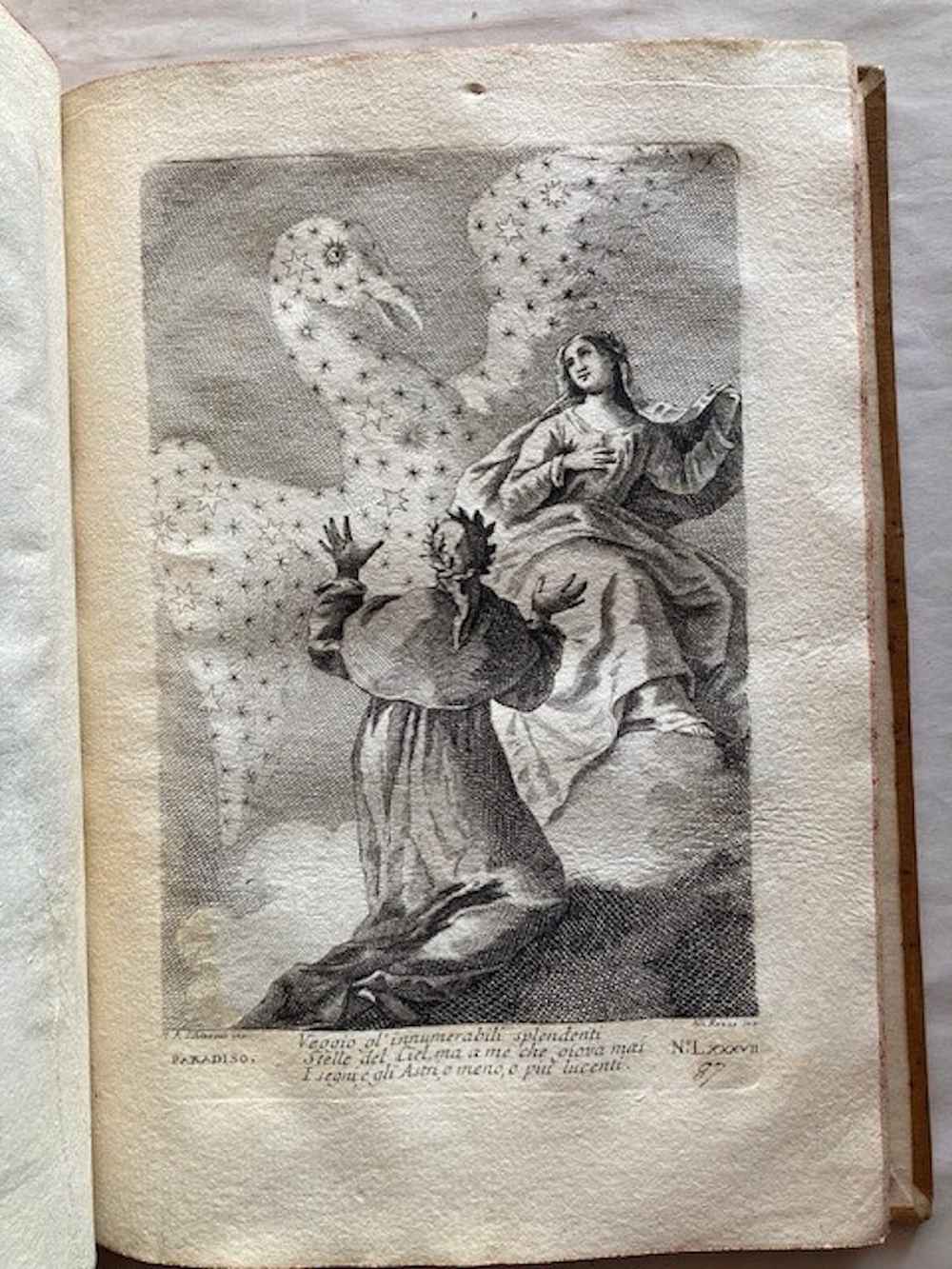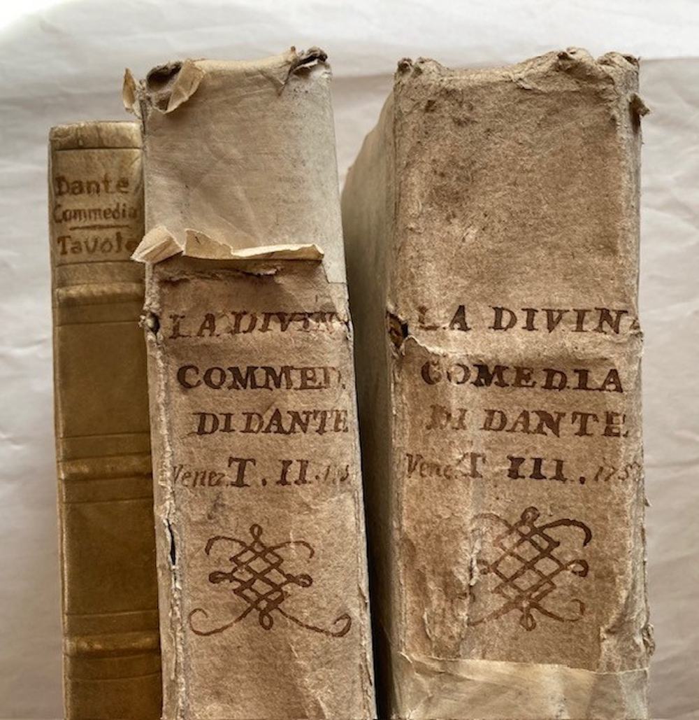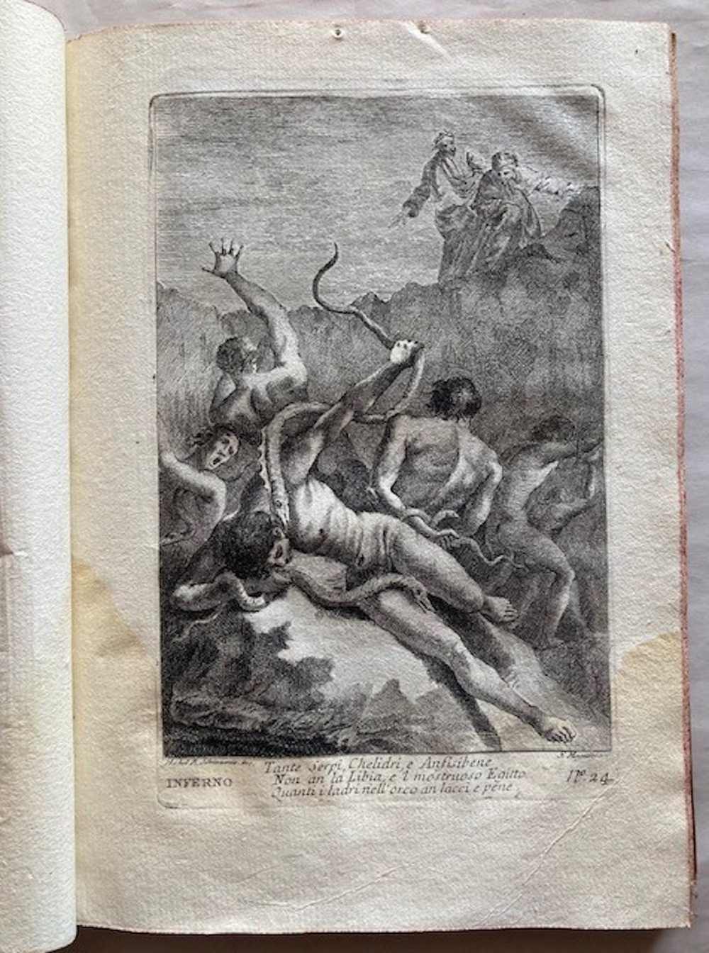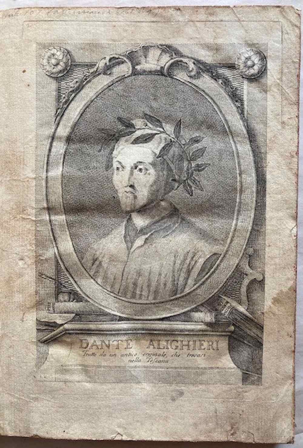 Ritratto inciso di Dante, complessivamente 107 tavole incise, di cui: 33 su 34 nell'Inferno (in quanto manca la tavola n. 6), 33 nel Purgatorio, e 31 nel Paradiso (la numerazione non presenta interruzioni ma evidentemente ne mancano 2) , più 7 tavole aggiuntive di cui una ripetuta. Sembra che si tratti di una riedizione delle tavole originali, ora numerate (la numerazione delle tavole non compare nell'edizione originale). Le tavole sono incise da: Gaetano Zompini, Giuliano Giampiccoli, Francesco Fontebasso, Gasparo Diziani, Bartolomeo Crivellari, Giuliano Zuliani, Jacopo Guarana ed altri. Un insieme quasi completo delle illustrazioni incise della più famosa edizione dantesca del XVIII secolo. Morazzoni 255. De Batines I, 112. Koch I, 1. Mambelli 65: «Stimata edizione». Gamba,396: "Edizione fatta con lusso".
