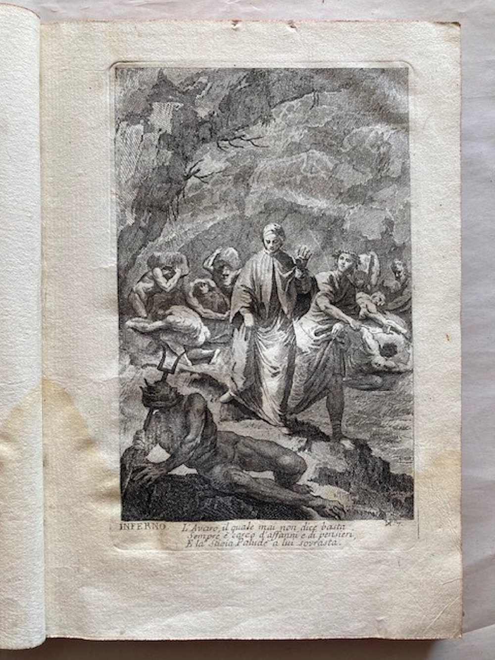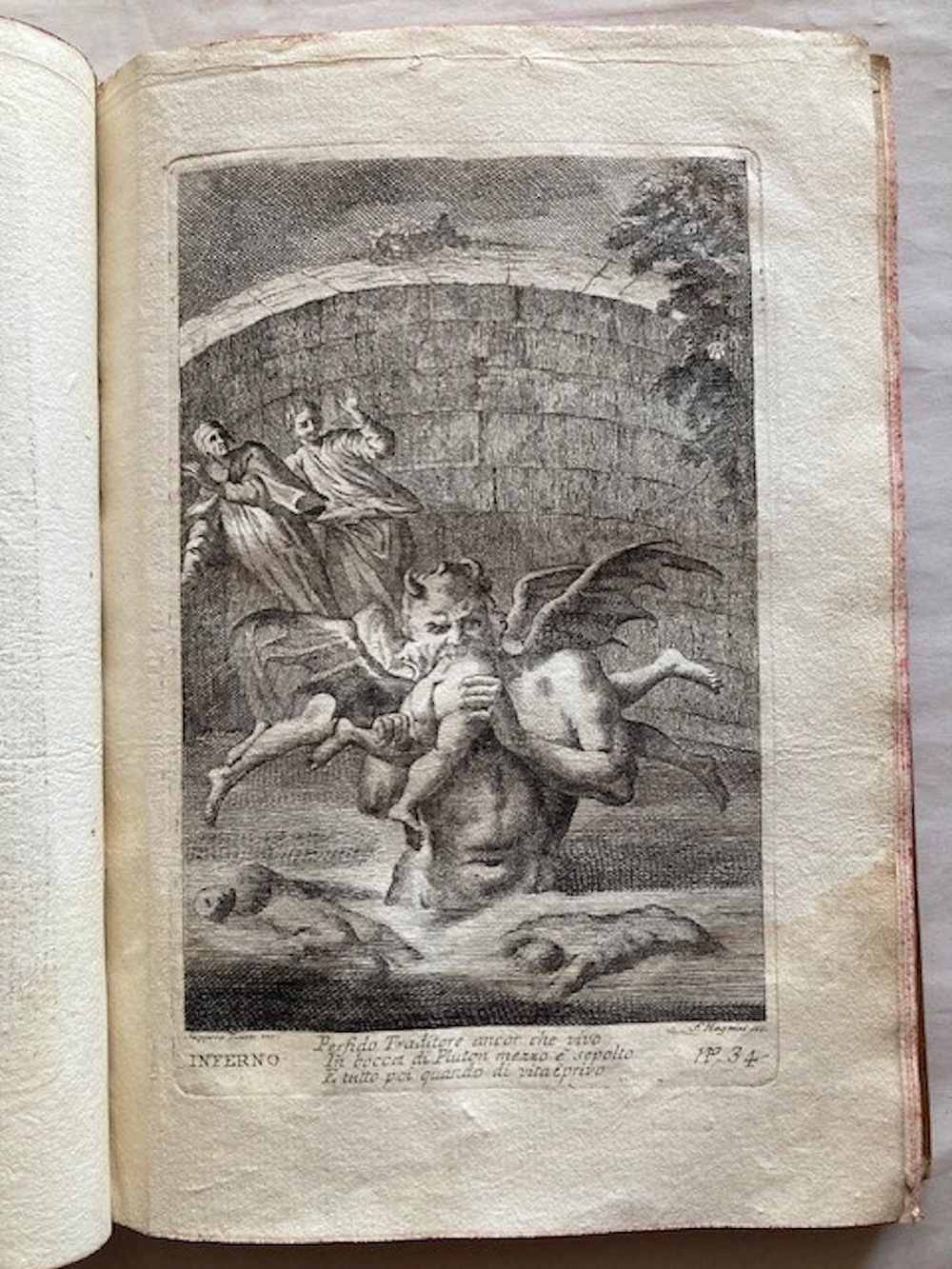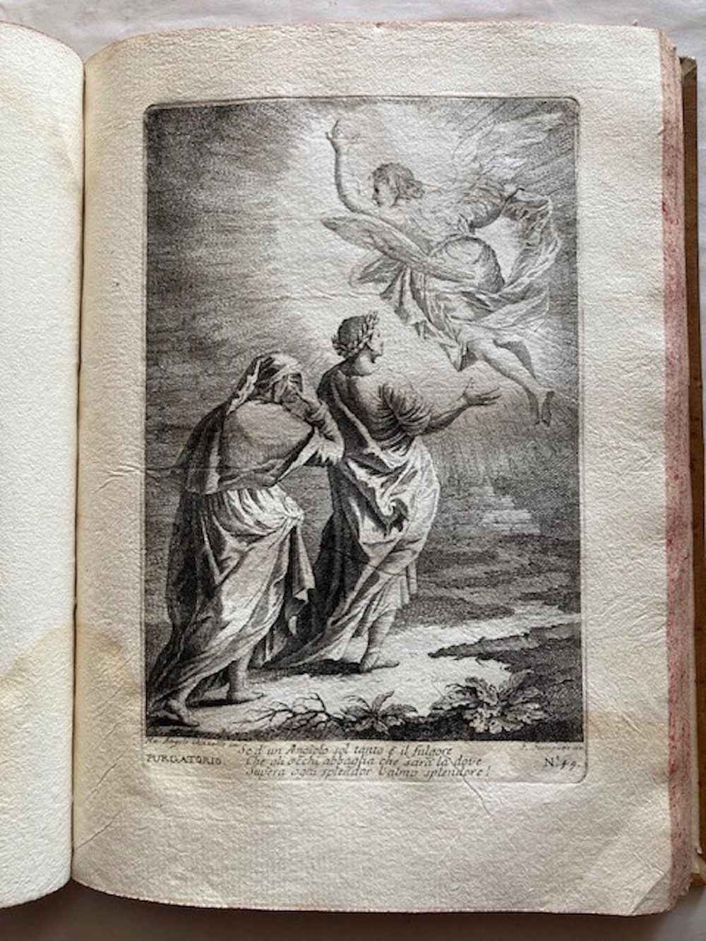 Ritratto inciso di Dante, complessivamente 107 tavole incise, di cui: 33 su 34 nell'Inferno (in quanto manca la tavola n. 6), 33 nel Purgatorio, e 31 nel Paradiso (la numerazione non presenta interruzioni ma evidentemente ne mancano 2) , più 7 tavole aggiuntive di cui una ripetuta. Sembra che si tratti di una riedizione delle tavole originali, ora numerate (la numerazione delle tavole non compare nell'edizione originale). Le tavole sono incise da: Gaetano Zompini, Giuliano Giampiccoli, Francesco Fontebasso, Gasparo Diziani, Bartolomeo Crivellari, Giuliano Zuliani, Jacopo Guarana ed altri. Un insieme quasi completo delle illustrazioni incise della più famosa edizione dantesca del XVIII secolo. Morazzoni 255. De Batines I, 112. Koch I, 1. Mambelli 65: «Stimata edizione». Gamba,396: "Edizione fatta con lusso".