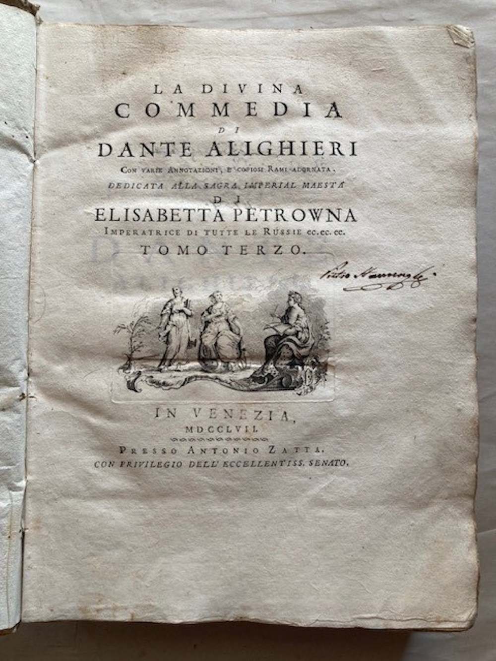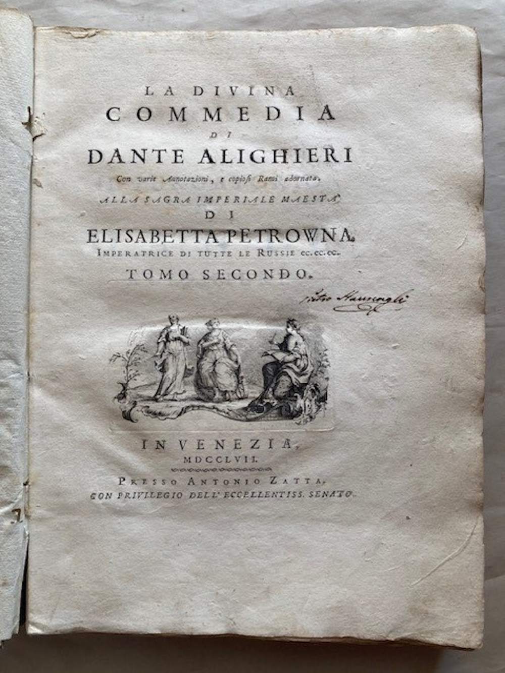 Venduto insieme a due volumi di testo della stessa edizione Zatta, vol. II e III, apparentemente completi in se stessi.