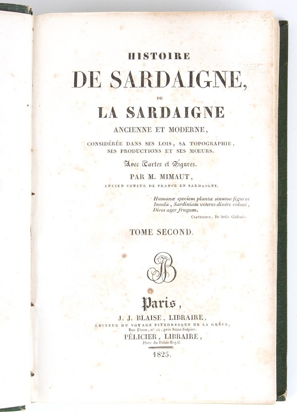MIMAUT JEAN FRANCOIS. Histoire de Sardaigne ou la Sardaigne ancienne et moderne considérée dans ses lois, sa topographie, ses productions et ses moeurs. Paris, Blaise - Pélicier, 1825