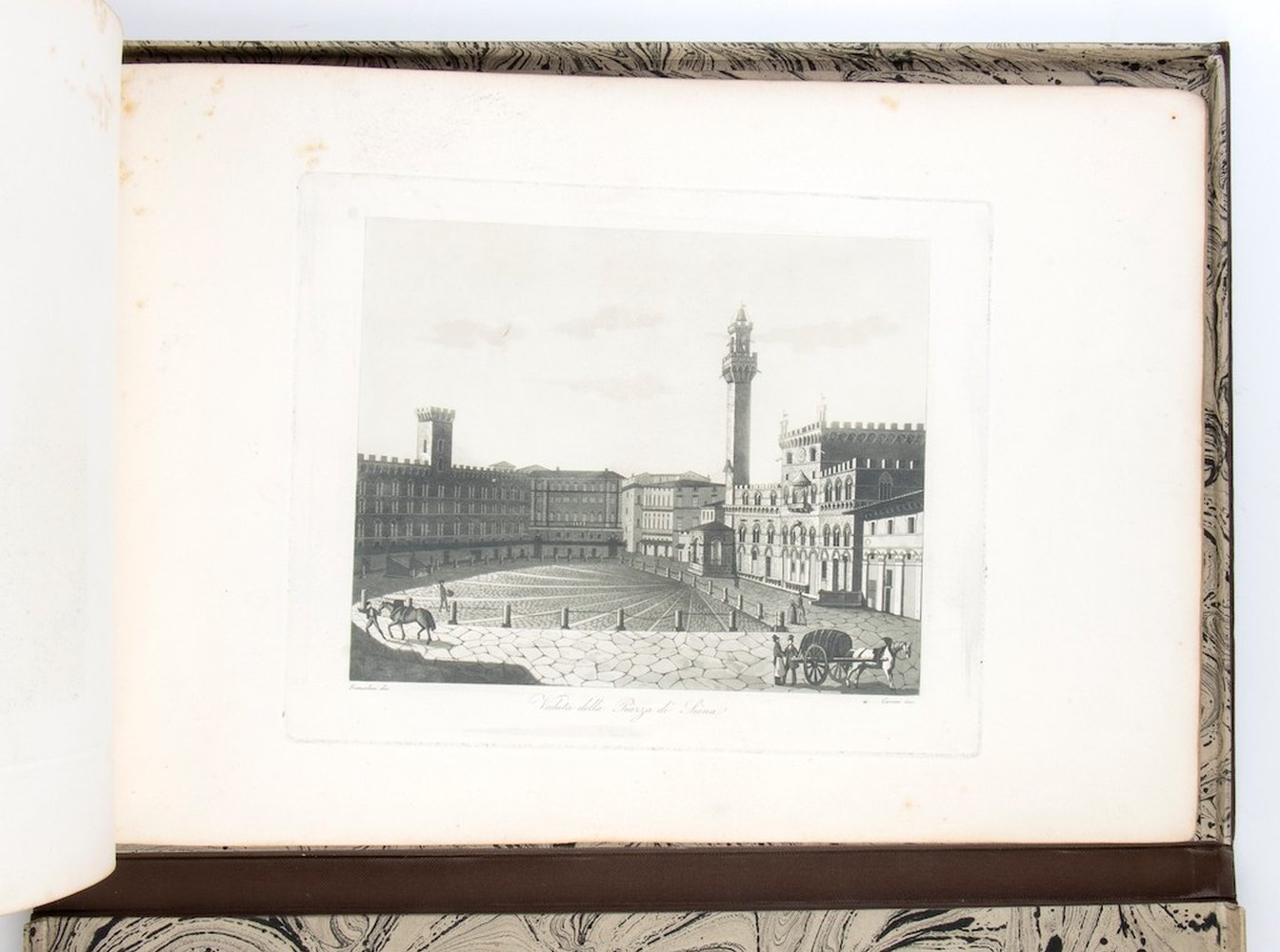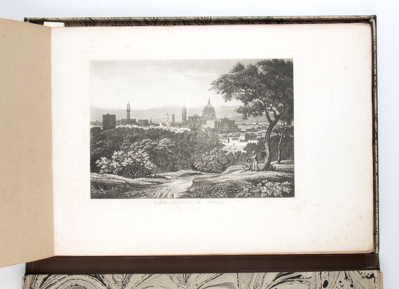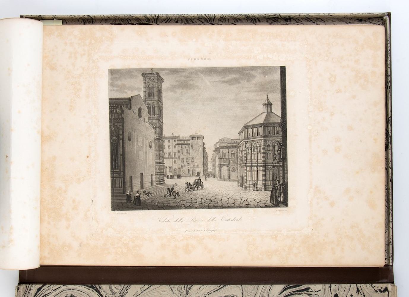 Album con 27 tavole raffiguranti vedute di Firenze, incise ad acquaforte ed acquatinta da varii artisti. Belle impressioni, generalmente in ottimo stato di conservazione salvo qualche macchia. Album entro custodia in pelle.