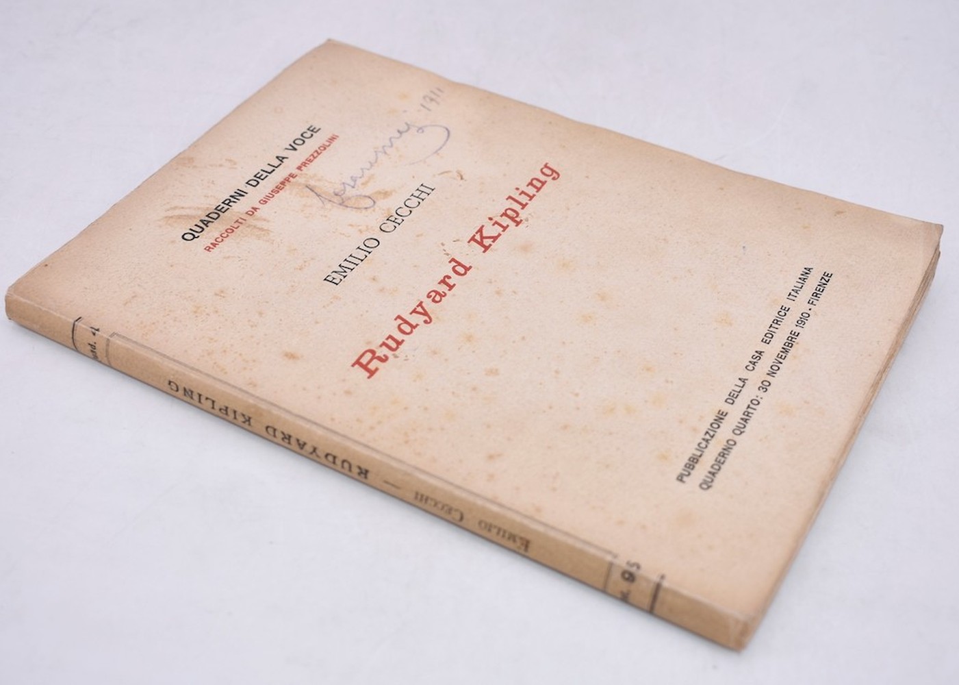 Prima edizione, collezione Quaderni della Voce. Edizione priva di frontespizio, con un ritratto di Kipling f.t. Esemplare con segni di matita nel testo, una firma di possesso al piatto.