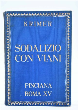 Prima edizione delle memorie di Krimer sul suo rapporto con l’artista Lorenzo Viani. Esemplare con dedica autografa di Paolo Mercati Krimer, nella rara legatura di lusso in seta con titoli in oro entro cornice fregiata al piatto. Con tavole illustrate. Volume con dorso sbiadito.