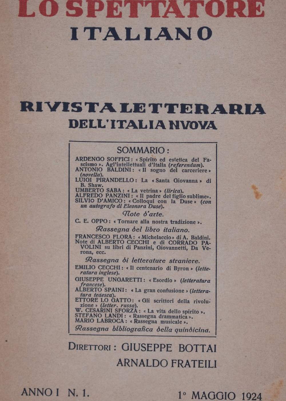 Rara pubblicazione diretta da Giuseppe Bottai con saggi critici di letteratura e cultura italiana. La rivista idealmente affiancava il periodico “Critica Fascista” nella propaganda politica del Regime; a questo scopo proponeva il meglio degli autori dell'epoca come Ardengo Soffici, Luigi Pirandello, Umberto Saba, Alfredo Panzini, Giuseppe Ungaretti, Ettore Lo Gatto e altri ancora. L’esemplare conserva il fac-simile autografo con la lettera di Eleonora Duse a Silvio D’Amico.