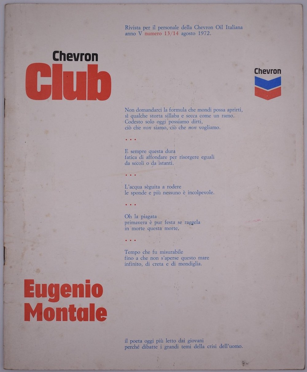 Rivista di attualità e cultura per il personale della compagnia petrolifera Chevron. Anno V n. 13/14, dedicato a Eugenio Montale. Illustrato.