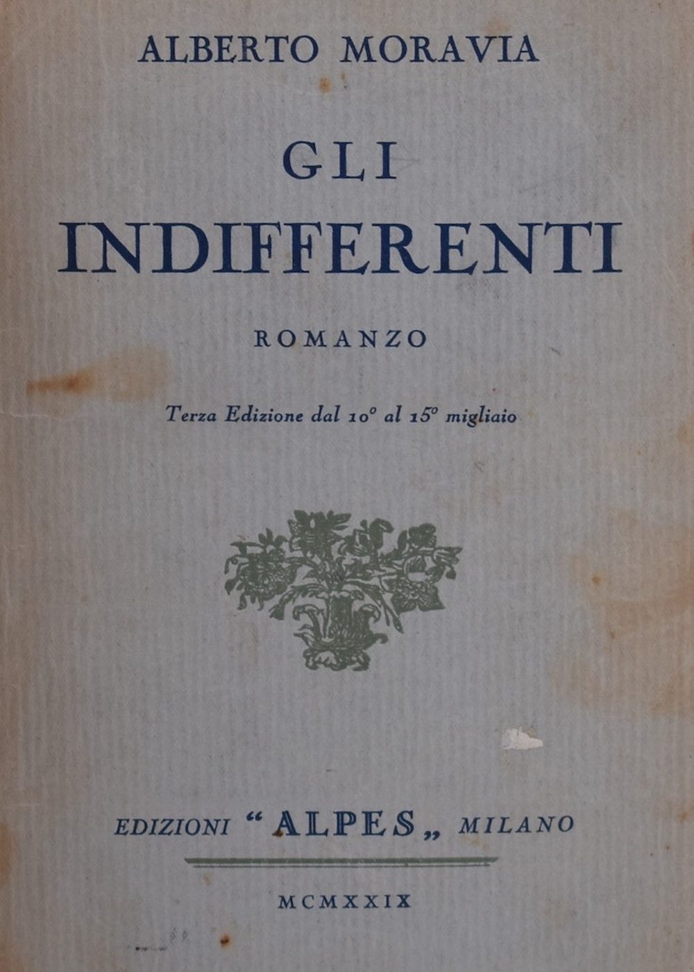 Terza edizione (il colophon riporta la 2a) dell’opera prima di Moravia. Legatura post. in mezza tela con la brossura conservata.