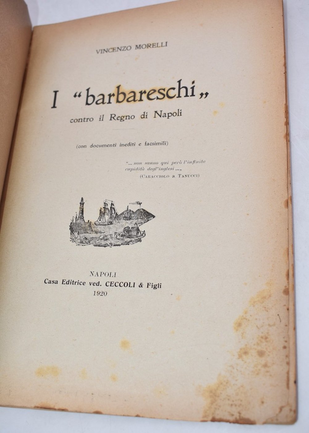 MORELLI, Vincenzo. I “BARBARESCHI” CONTRO IL REGNO DI NAPOLI. CON DOCUMENTI INEDITI E FACSIMILI. 1920.