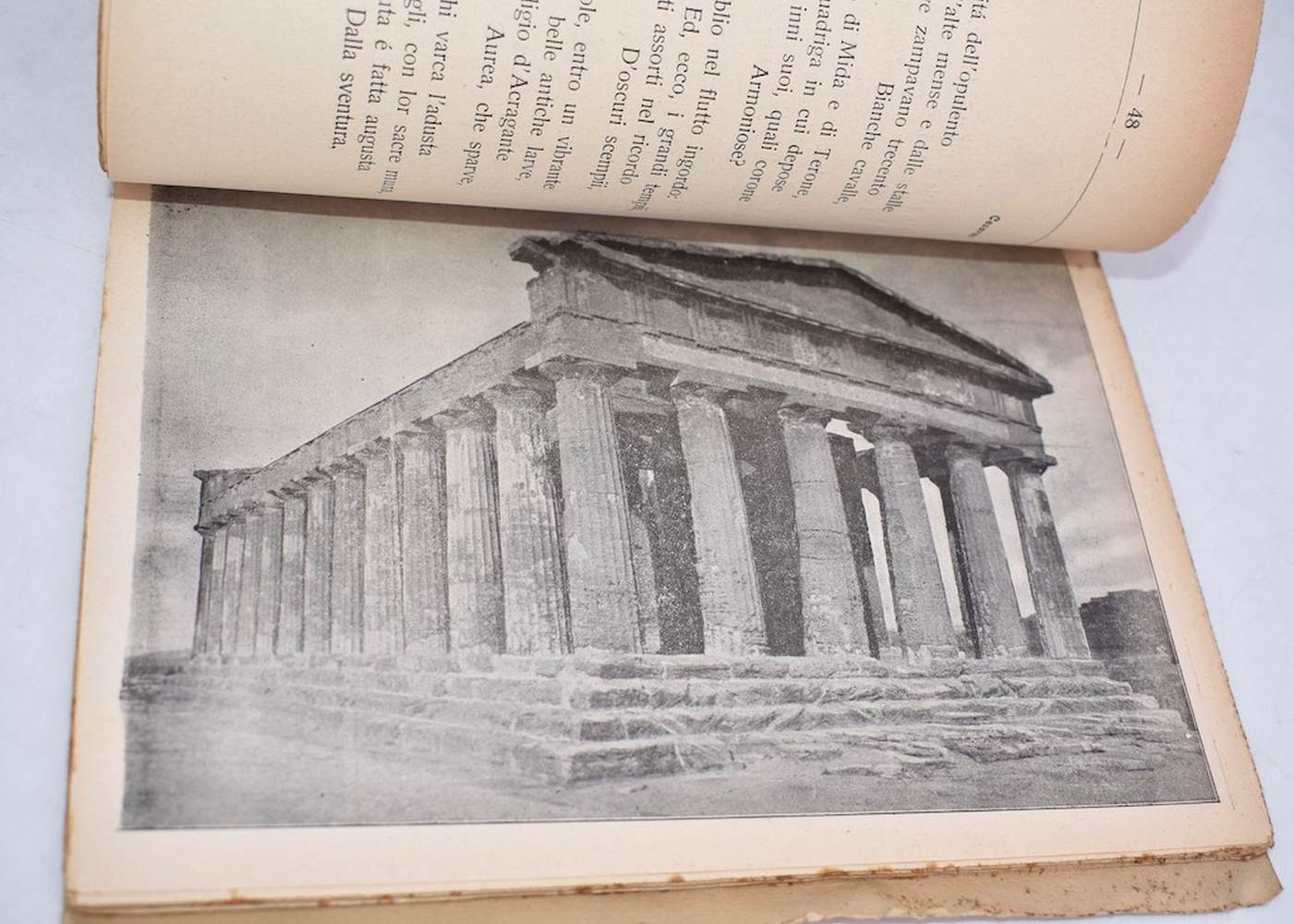 Prima edizione. Volume illustrato. Tra gli autori citati in questa opera di epoca fascista pubblicata in Sicilia compare anche Luigi Pirandello. Illustrazione con colonne antiche al piatto e un fregio tipografico con granchio.
