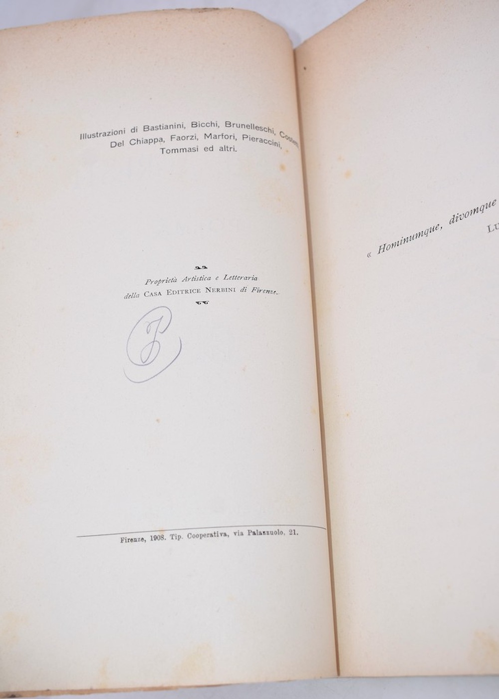 Prima edizione, esemplare con iniziali autografe dell'A. Tavole illustrate di Bastianini, Bicchi, Brunelleschi, Costetti, Del Chiappa, Faorzi, Marfori, Pieraccini, Tommasi e altri ancora. Illustrazione in copertina di Giovanni Costetti.